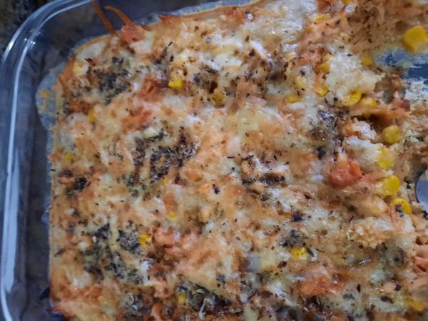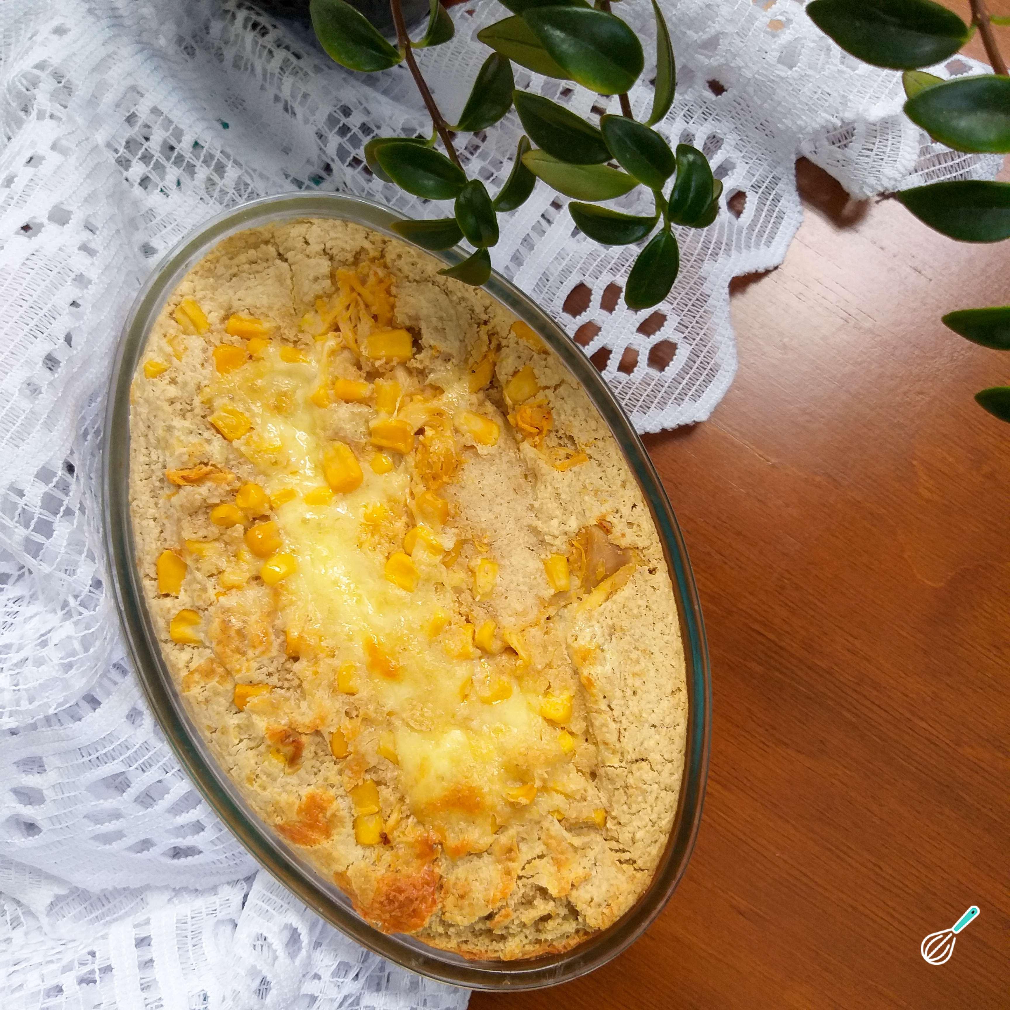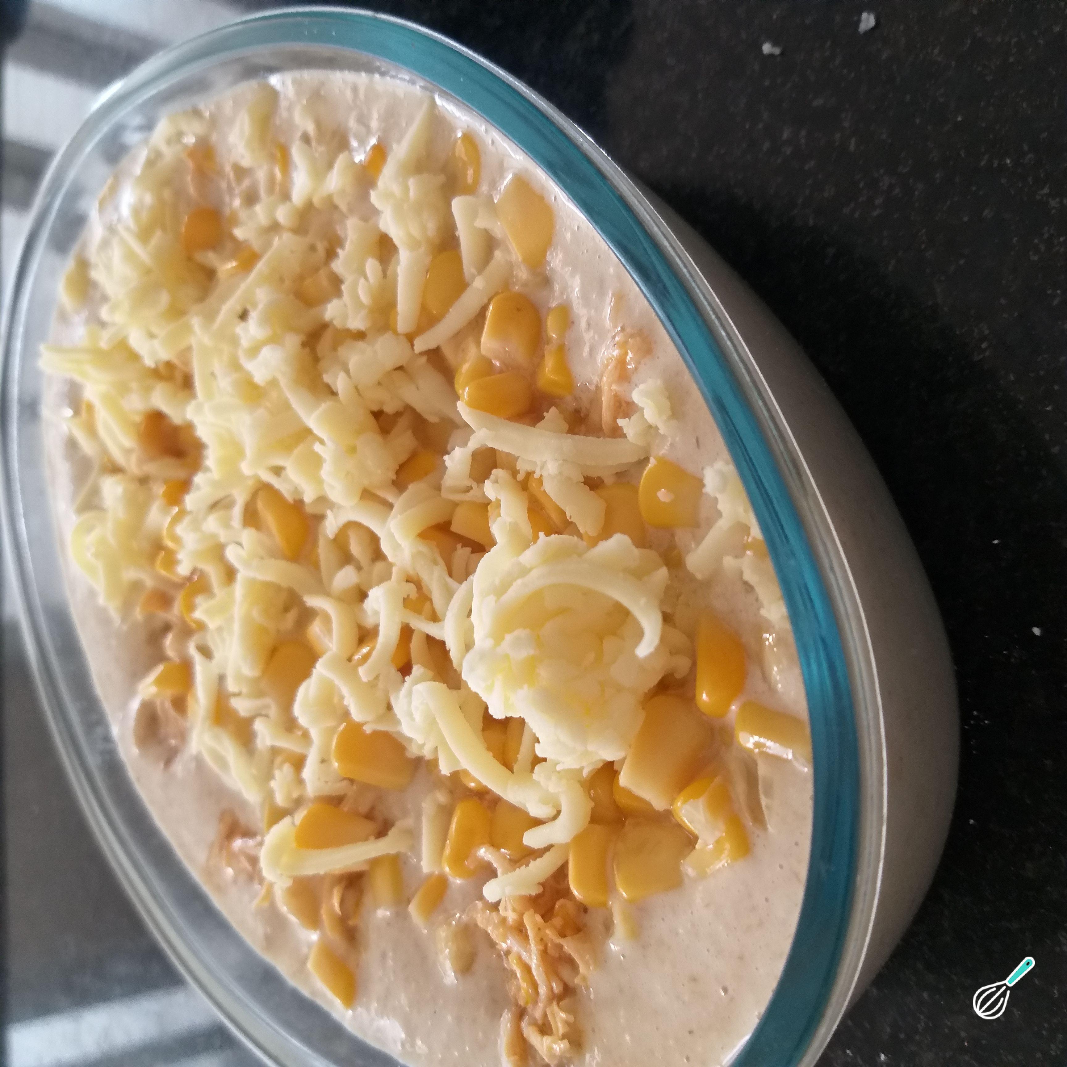 Transfira a massa para uma forma untada e acrescente o recheio a seu gosto - neste caso usei frango cozido e desfiado, milho e queijo ralado, mas você pode usar qualquer opção da sua preferência.
