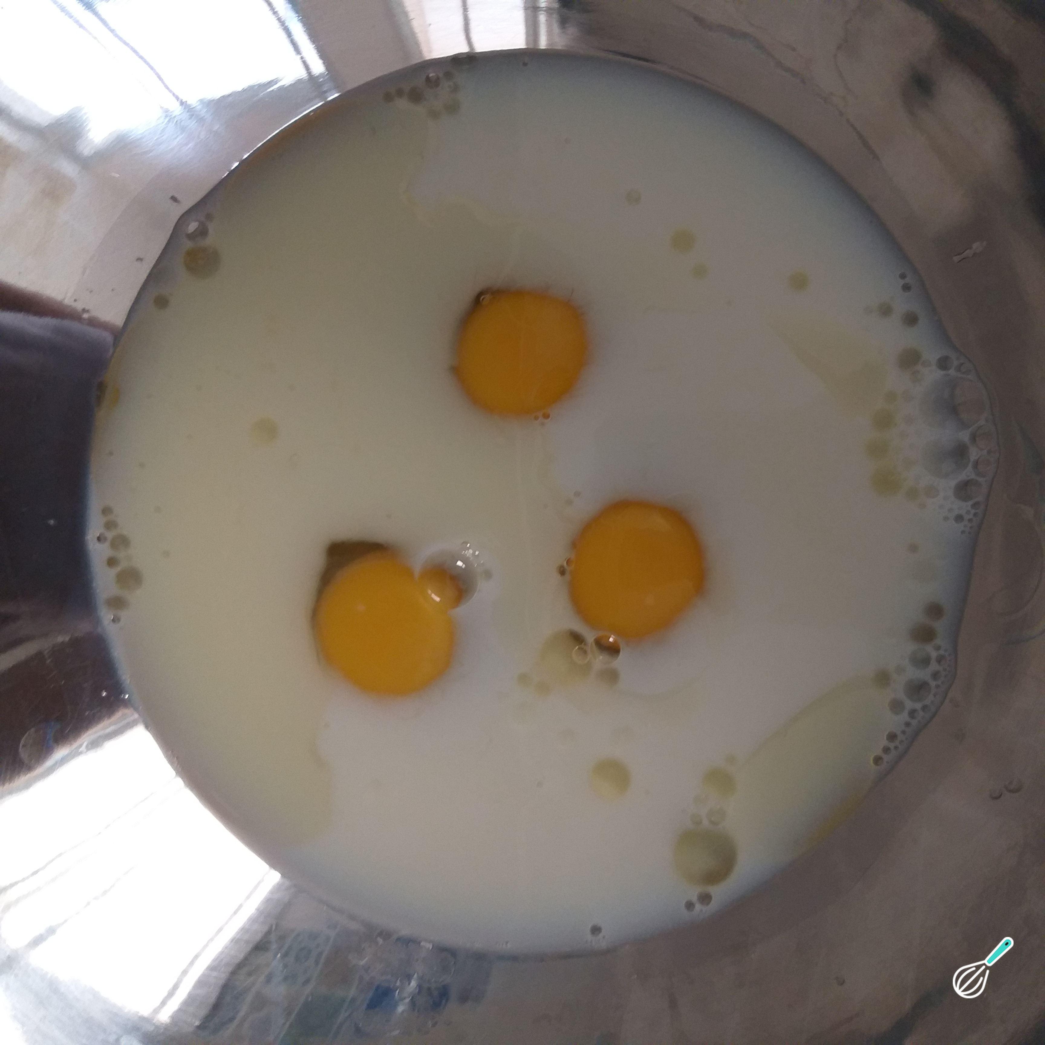 Em uma tigela coloque os ovos, o leite e o óleo. Misture bem com um batedor de arame.