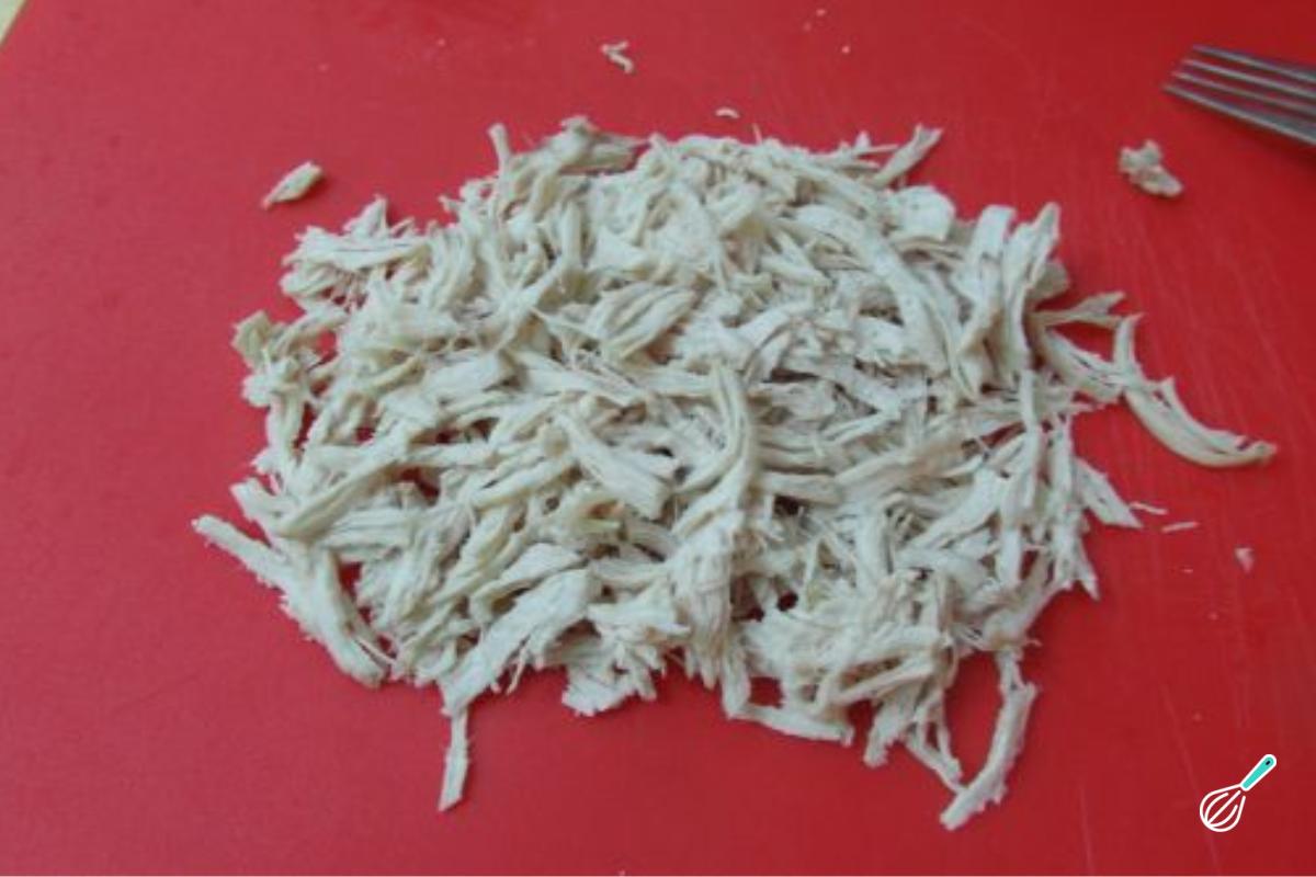 Comece esta torta de frango de massa podre preparando o recheio. Para isso, desfie o frango já cozido, separando em pedaços bem soltinhos para que se misturem melhor aos temperos depois. Se não tiver sobras prontas, não tem problema: basta colocar um peito de frango em uma panela com água suficiente para cobrir, acrescentar sal e uma pitada de pimenta-do-reino. Cozinhe em fogo médio até que a carne esteja macia e fácil de desfiar. Depois de pronto, retire o peito de frango, deixe esfriar um pouco e desfie com ajuda de dois garfos ou mesmo com as mãos, garantindo uma textura uniforme para o recheio da sua massa de torta de frango.