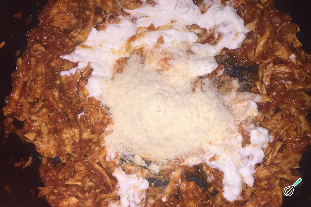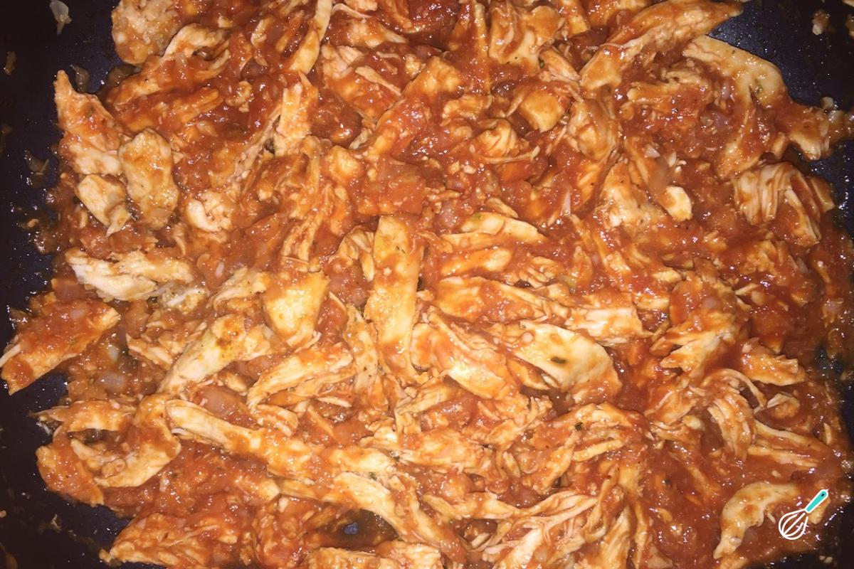 Junte o frango, o molho de tomate, tempere com salsinha picada, pimenta do reino, sal e misture. Deixe refogar por aproximadamente 10 minutos em fogo médio.
