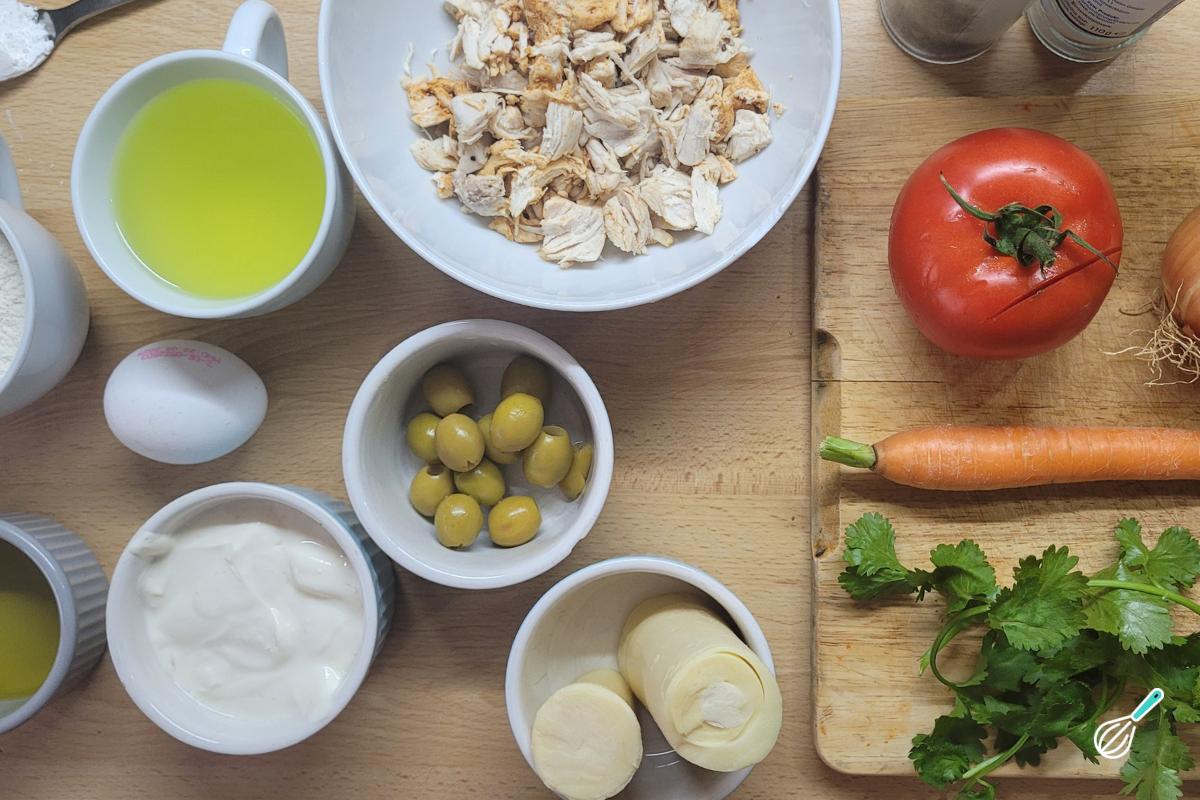Separe os ingredientes para fazer sua torta de frango com palmito e requeijão. Como meu requeijão era caseiro, sobrou soro de leite que usei na massa para mostrar que é possível aproveitar o soro para substituir o leite em receitas de massas, bolos e pães, mas você pode usar leite.