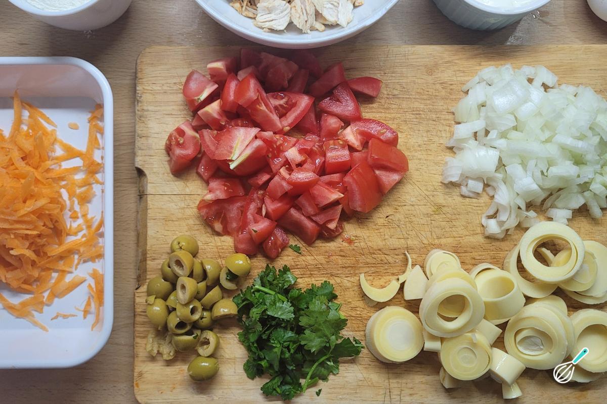 Como a massa fica pronta super rápido no liquidificador, vamos começar preparando o recheio para que ele esfrie um pouco antes de misturar com a massa. Comece cortando todos os vegetais.