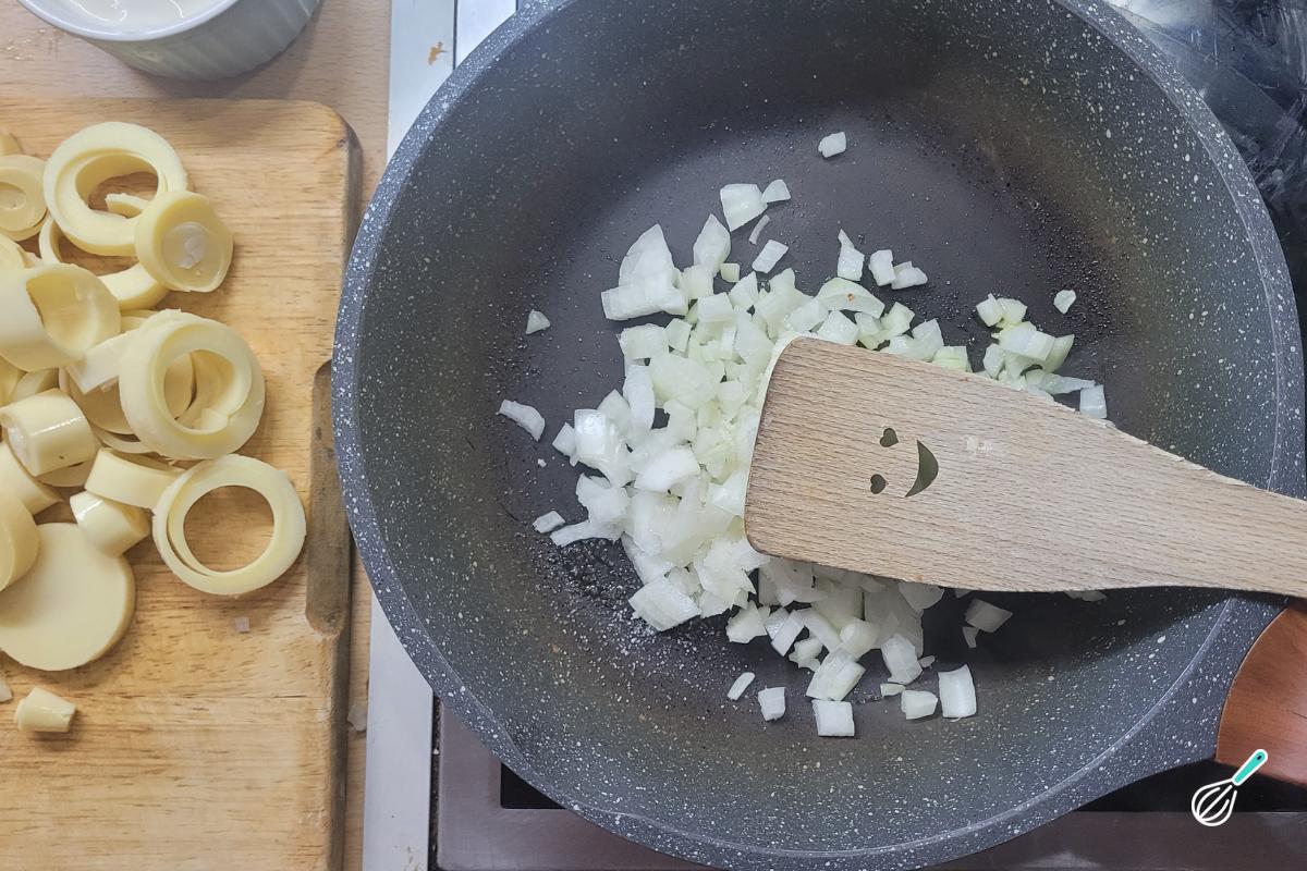Em uma frigideira, leve a cebola para dourar com um fio de azeite. Tempere com sal.