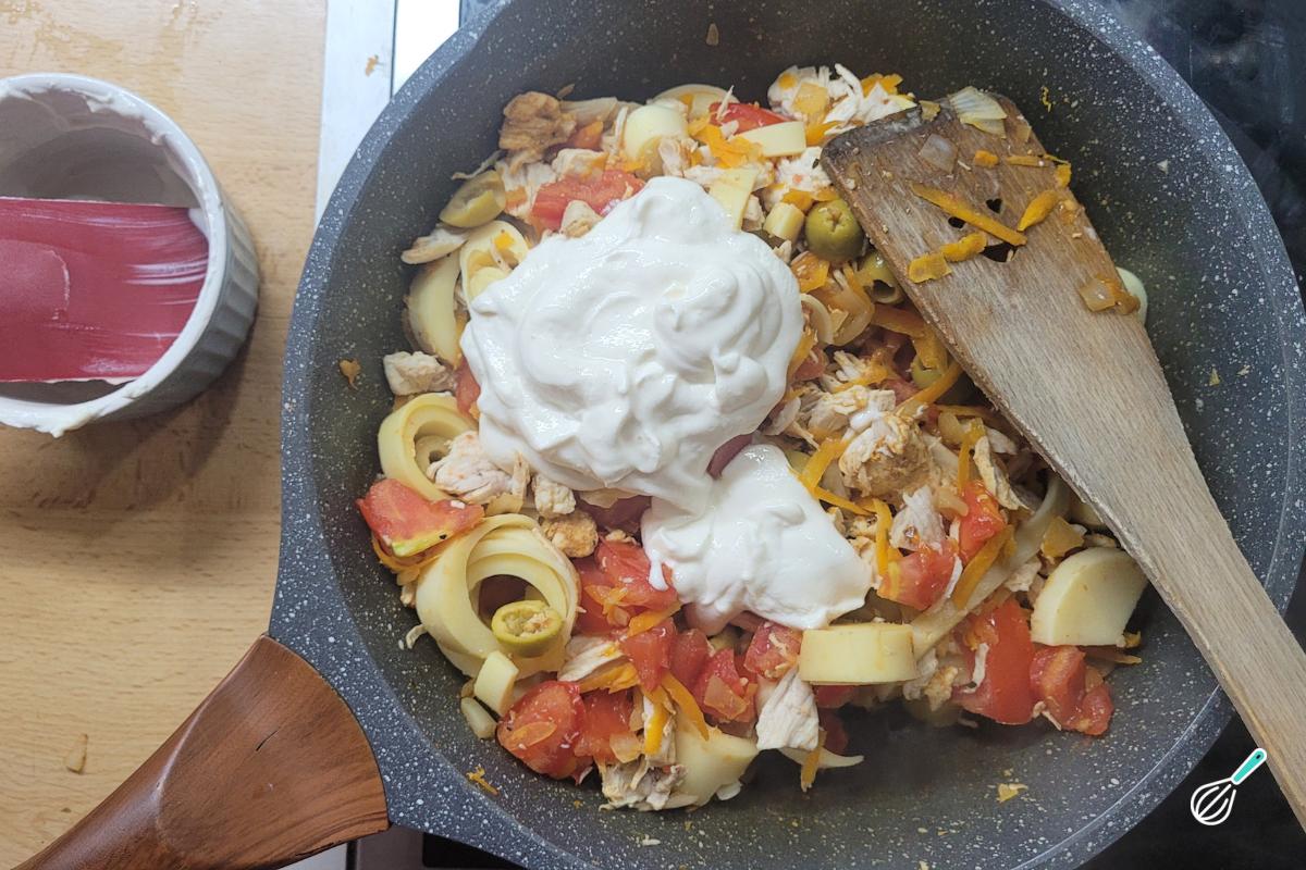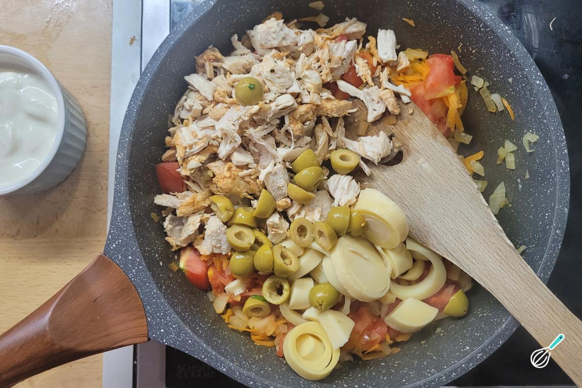 Nesse ponto, adicione o frango desfiado, o palmito e as azeitonas e deixe refogar por 1-2 minutos.