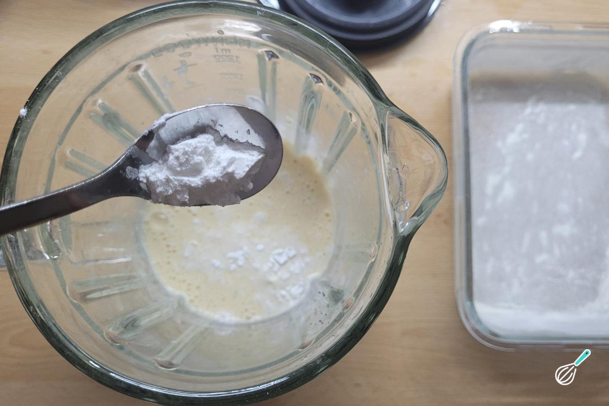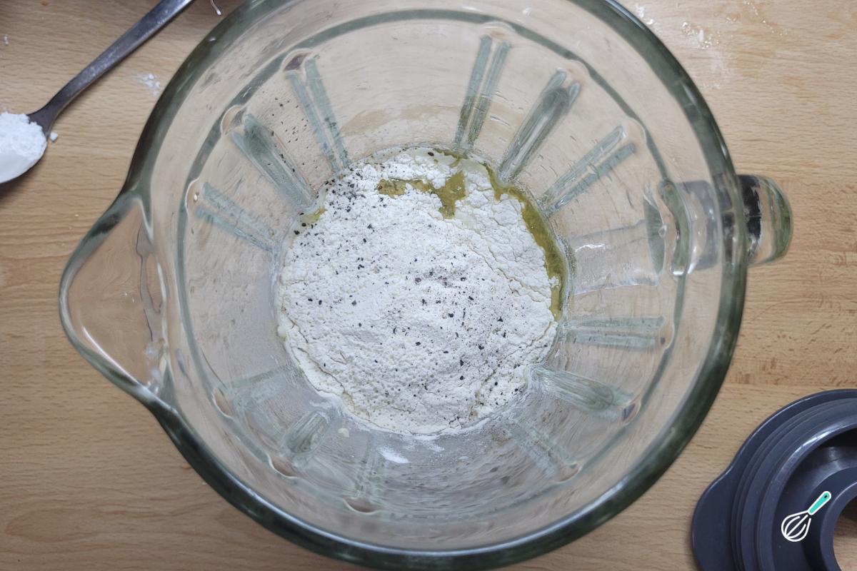 Para fazer a massa, adicione o ovo, o leite, o azeite e a farinha. Tempere com sal e pimenta-do-reino. Bata até ter uma massa homogênea e lisa.