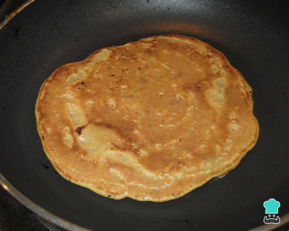 Coloque a massa da torta na frigideira em fogo médio (pode ser a mesma onde refogou os ingredientes ou numa outra frigideira levemente untada) e deixe cozinhar por uns 5 minutos.