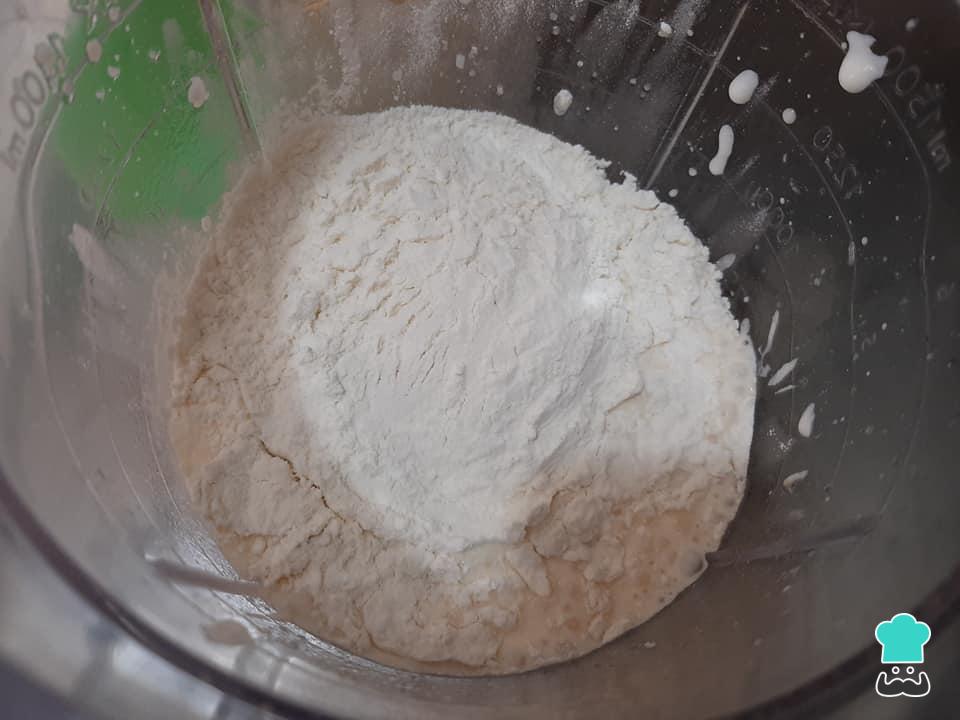 Adicione a farinha de trigo aos poucos no liquidificador e continue batendo, ate ficar bem homogêneo.