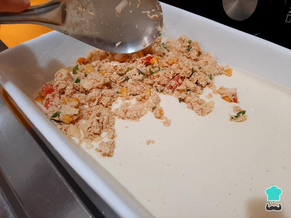 Num refratário médio, untado e enfarinhado, despeje metade da massa.