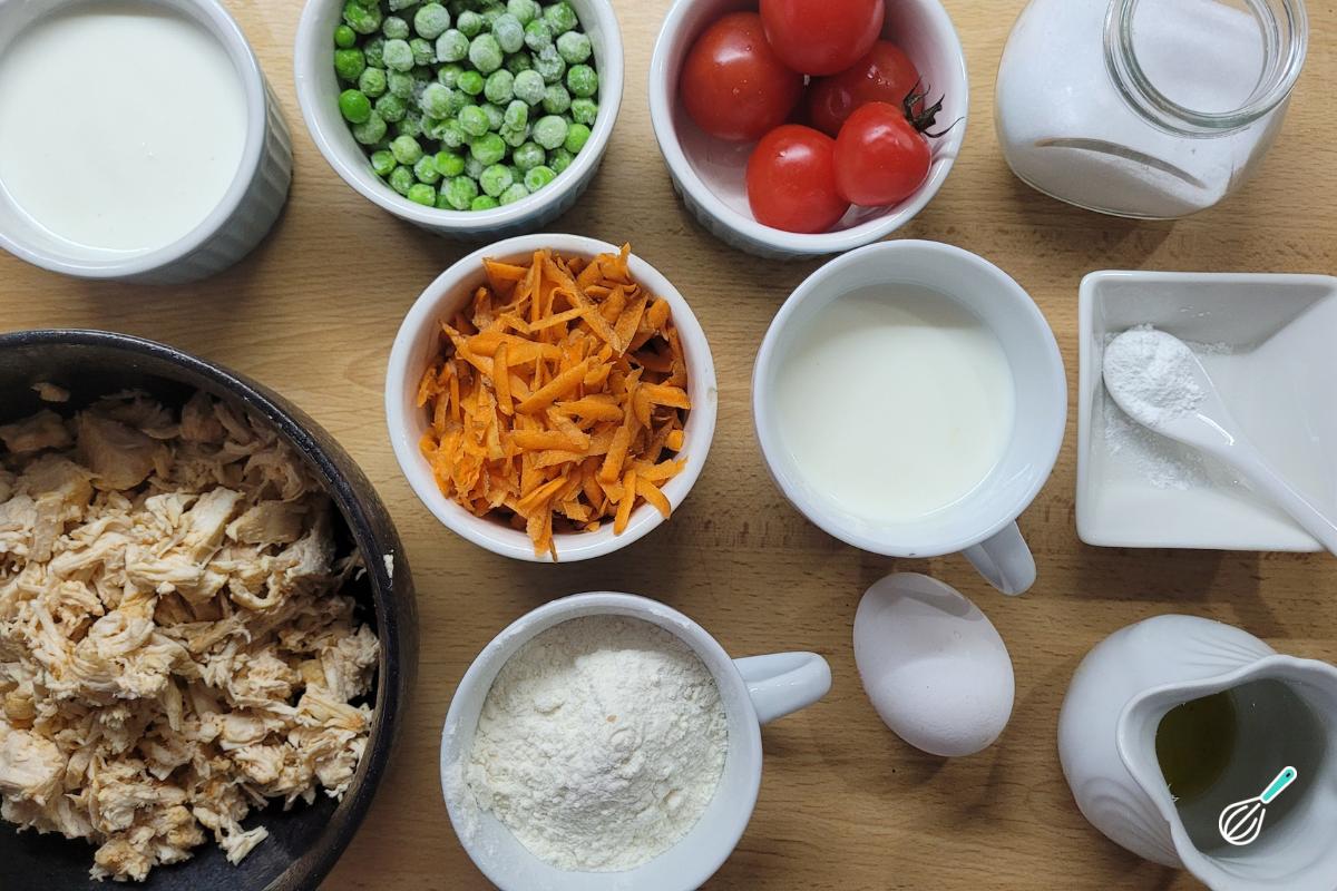 Separe os ingredientes para fazer sua torta de frango de micro-ondas. Aqui usei um frango desfiado caseiro que sempre tenho na geladeira pela praticidade, mas você pode comprar o peito de frango já cozido e desfiado.