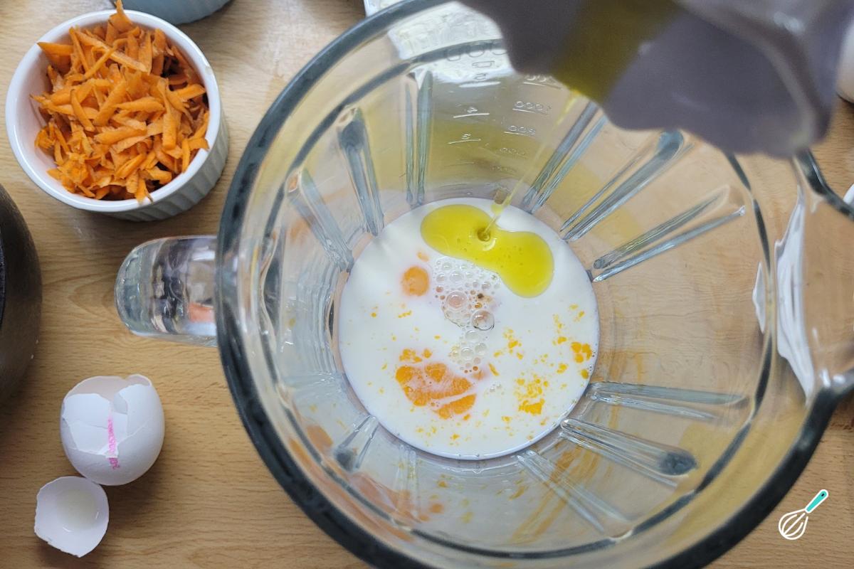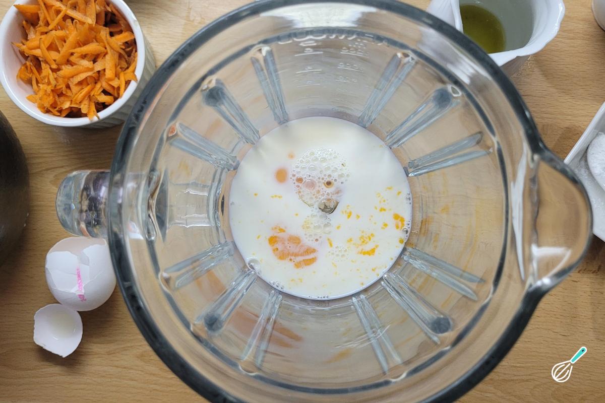 Vamos começar pela massa. Coloque os ovos e o leite no liquidificador.