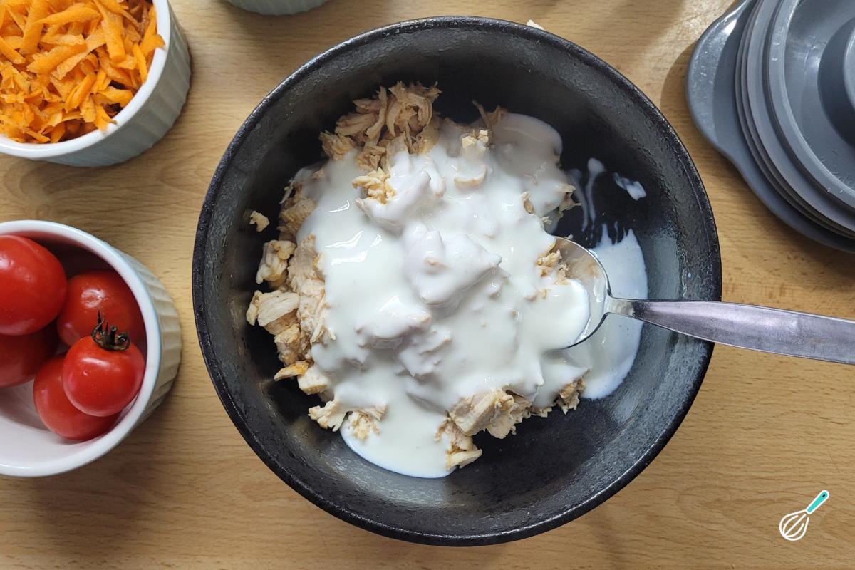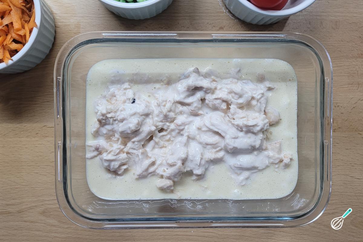 Reserve enquanto prepara o recheio. Misture o frango desfiado com o requeijão. Meu frango já estava temperado com sal, pimenta do reino e um pouco de páprica, mas caso o seu não esteja, aproveite para adicionar os temperos que preferir. Você pode misturar todos os ingredientes do recheio, mas eu prefiro misturar apenas o frango e o requeijão e fazer camadas com os outros ingredientes por cima.