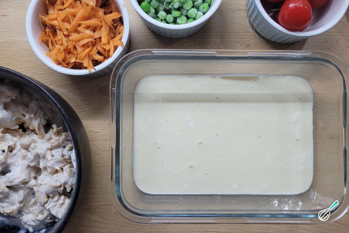 Em uma assadeira que possa ir ao micro-ondas, coloque metade da massa.