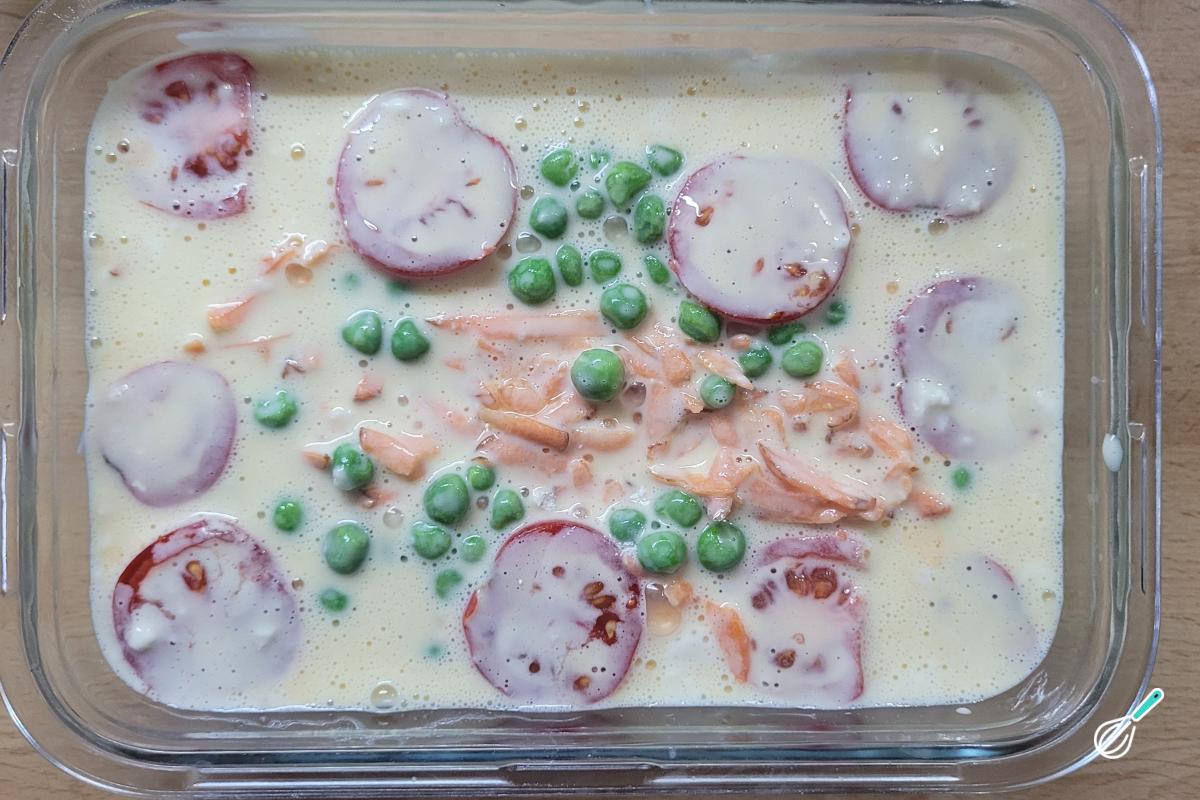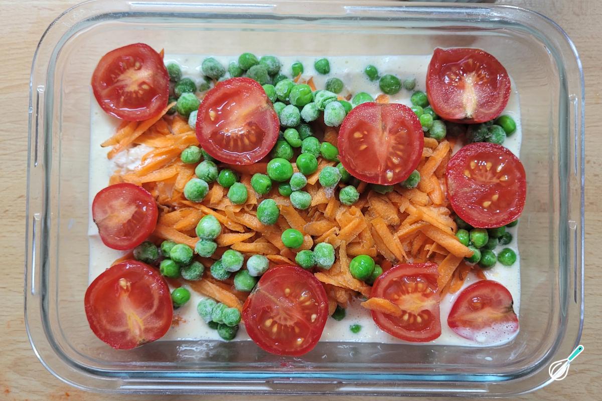 Cubra com a cenoura ralada, a ervilha e os tomates. A ervilha congelada irá descongelar e cozinhar junto no micro-ondas.