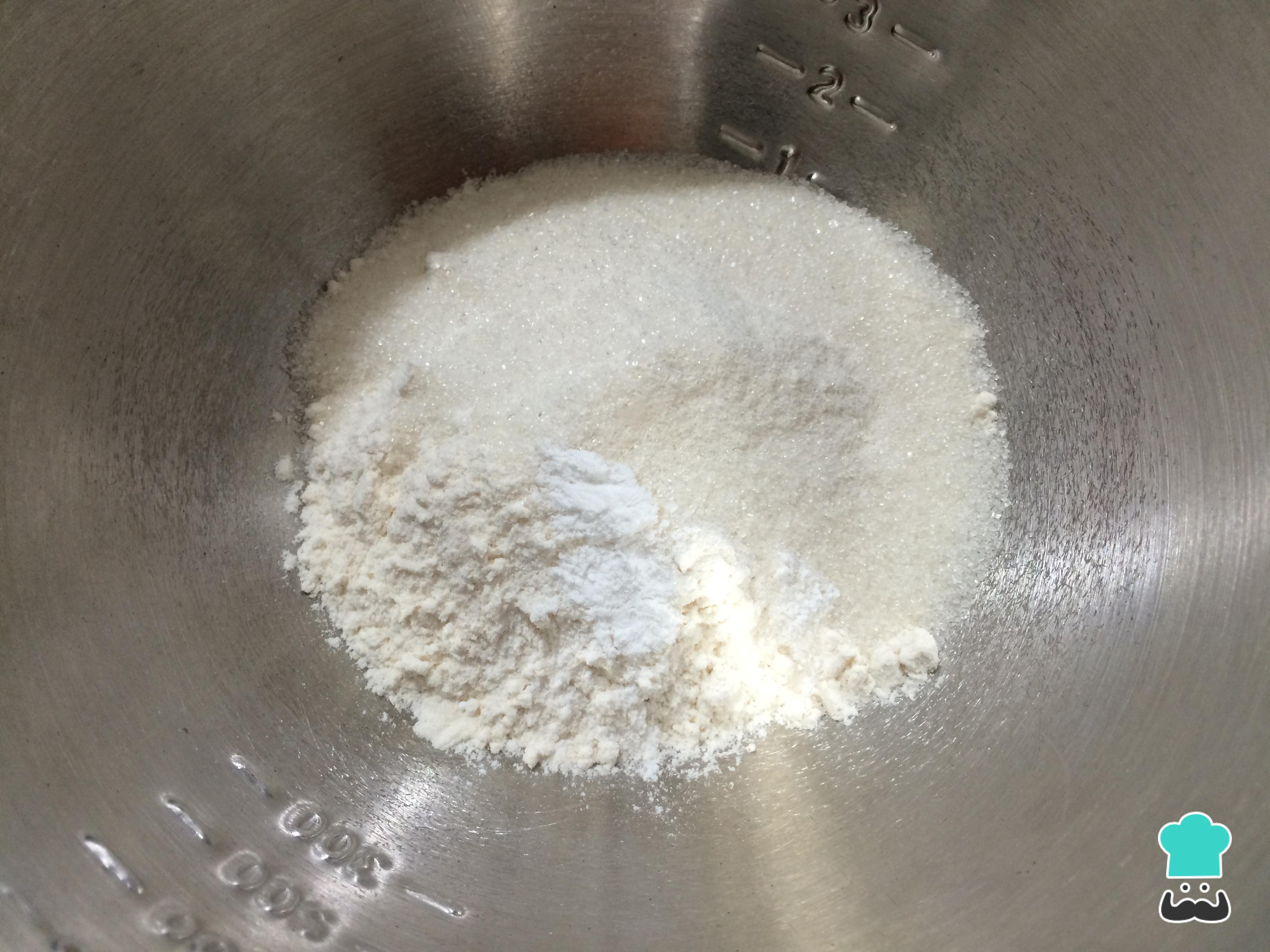 Comece por juntar os ingredientes secos (farinha, açúcar e fermento) numa tigela e misturar bem.