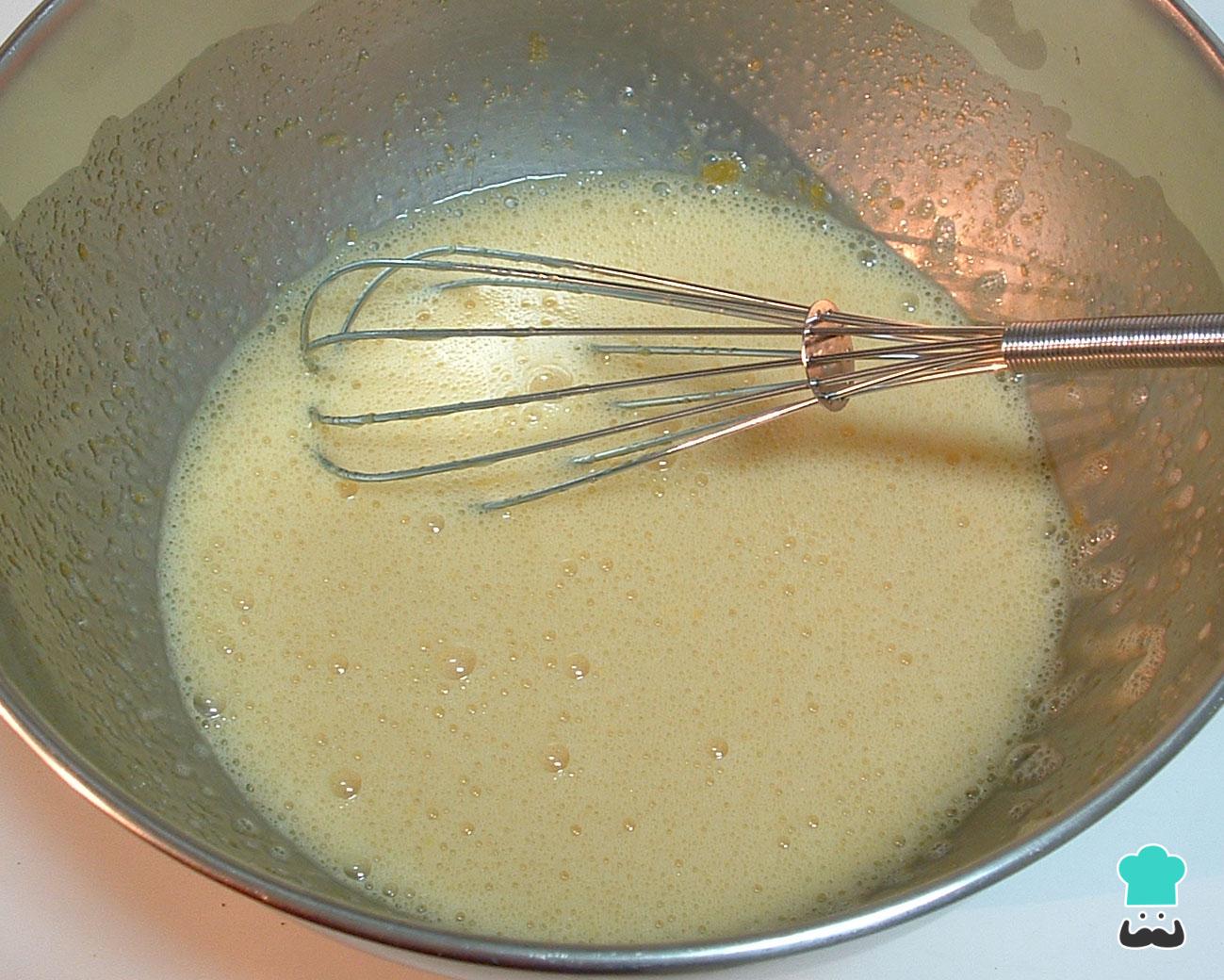 Numa tigela à parte bata os ovos até espumar e acrescente a raspa e suco das laranjas.