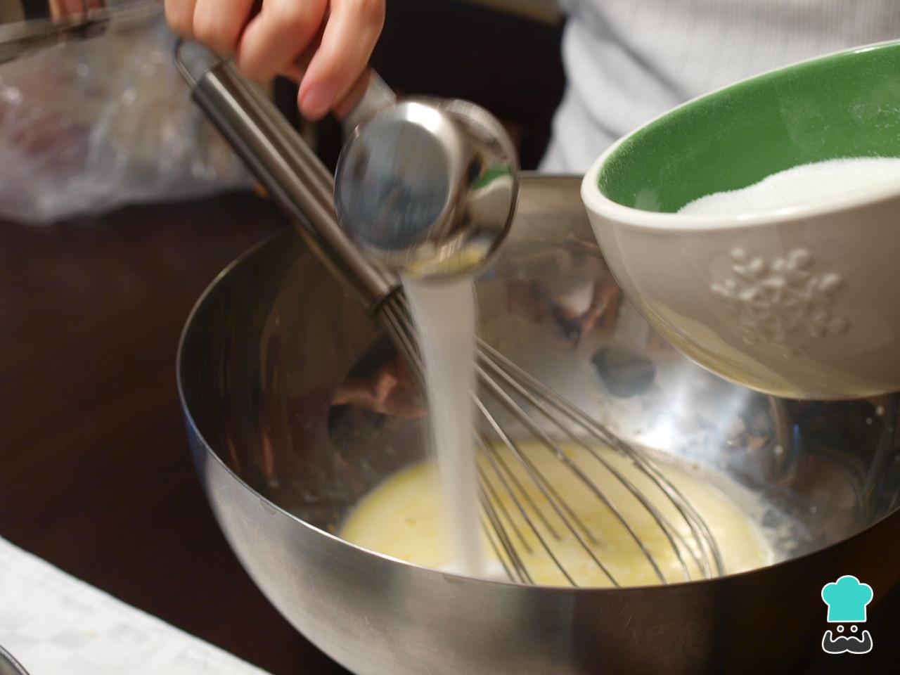 Acrescente os ingredientes secos aos ovos enquanto mistura muito bem. Continue batendo até desfazer todos os grãos de açúcar - para confirmar que bateu o suficiente, pegue num pouco da massa com os dedos e sinta se ainda restam grãos ou não.