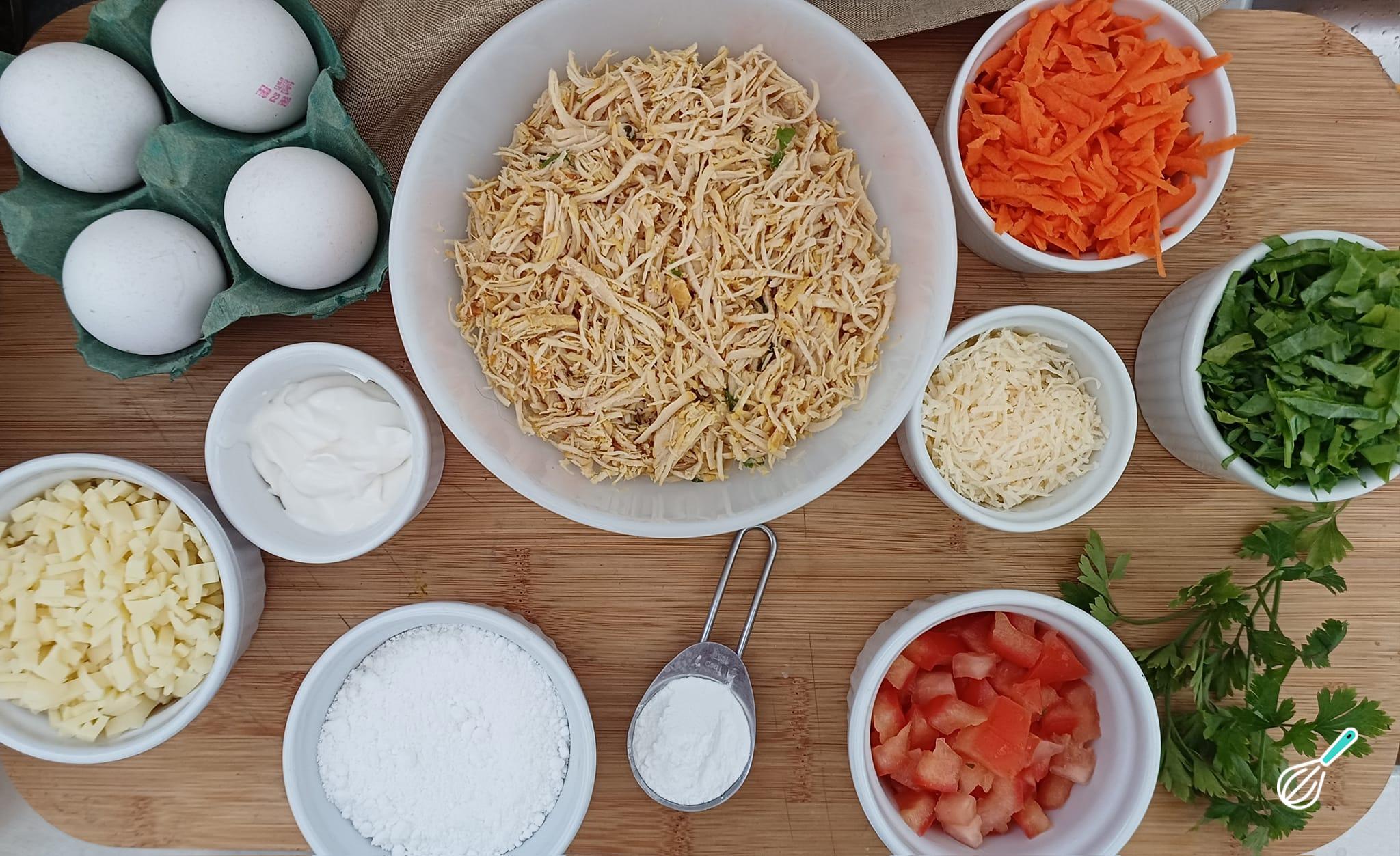 Separe todos os ingredientes necessários para o preparo desta receita de torta de legumes com frango.