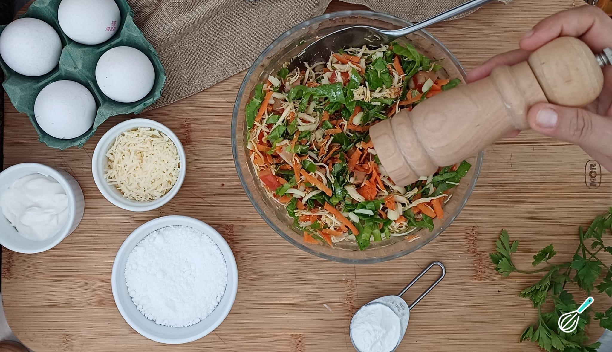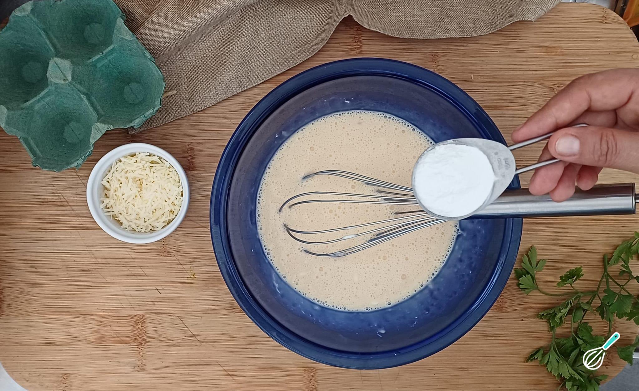 Tempere com sal e acrescente o fermento em pó, misturando novamente.