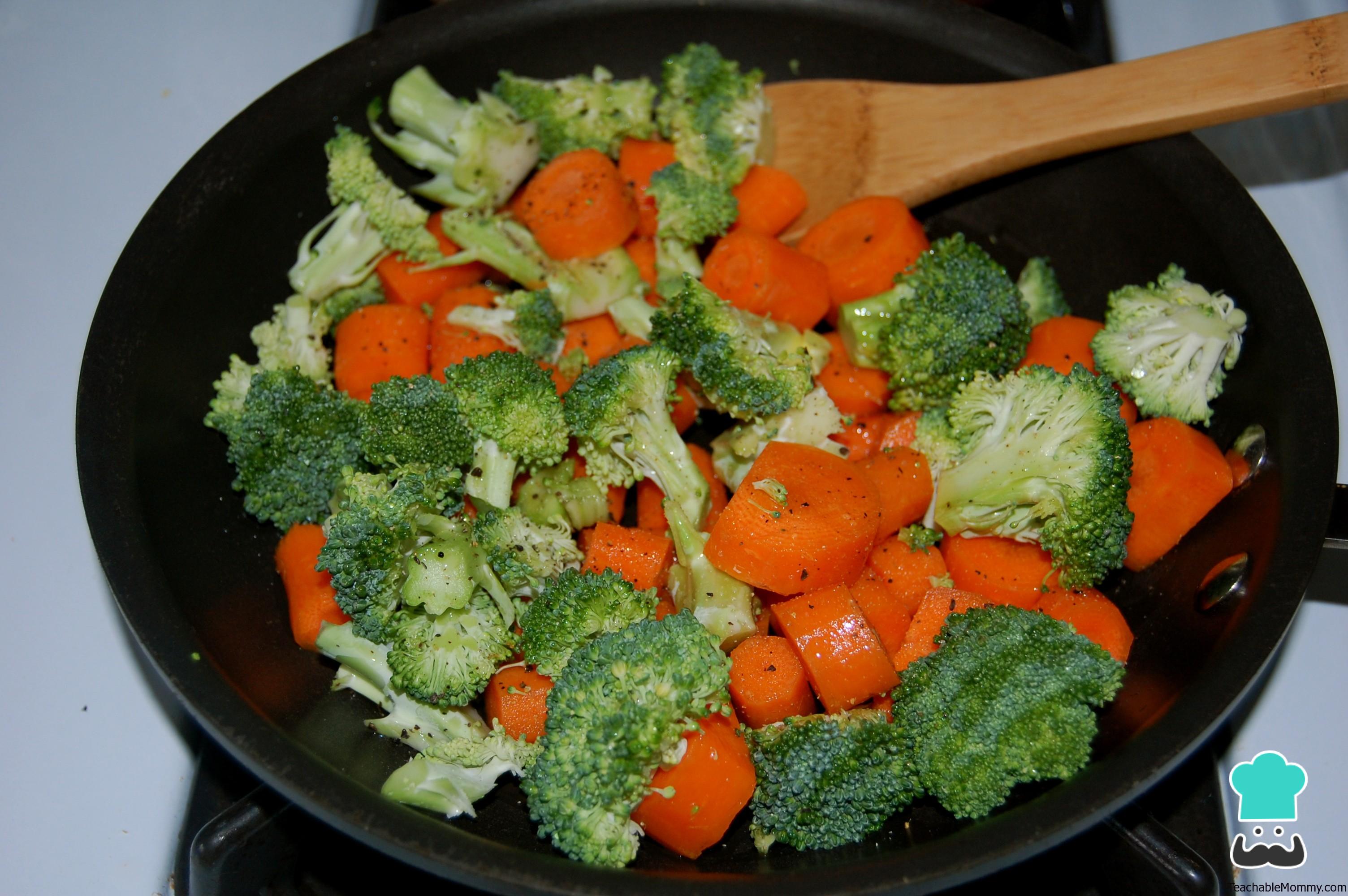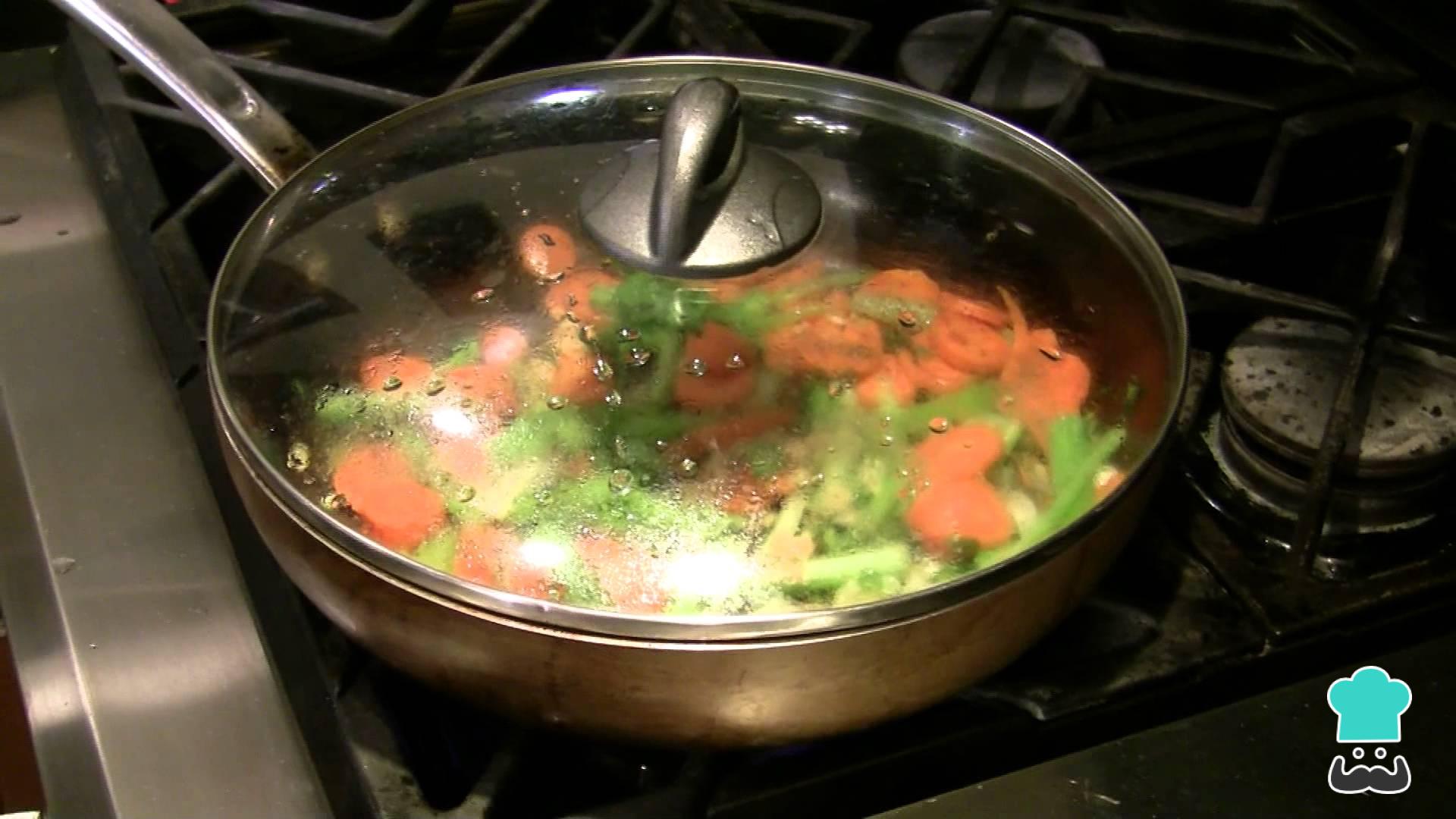 Em seguida tempere os legumes com sal e pimenta a gosto, adicione um pouco de água e deixe cozinhar tampados por 5-10 minutos. Desligue o fogo e deixe amornar.