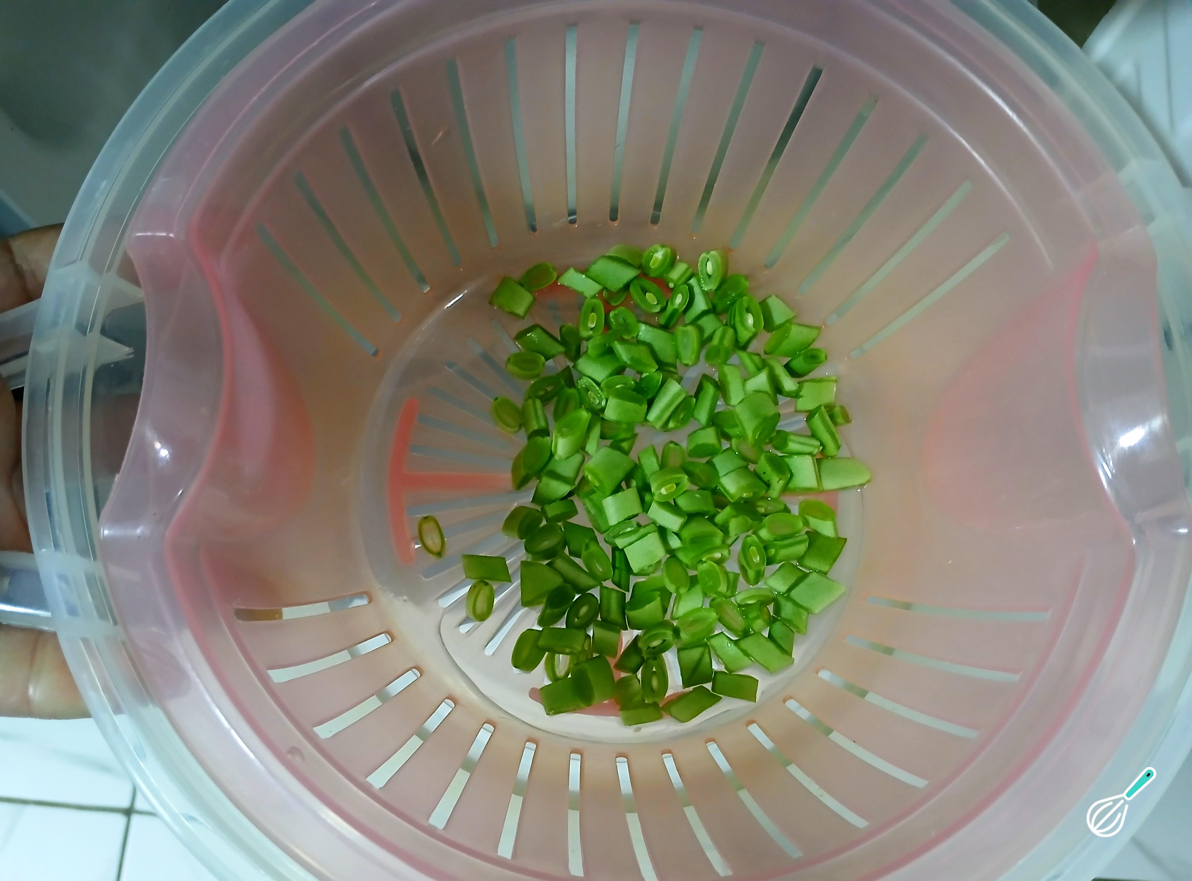 Feito isso, em uma panela para micro-ondas, coloque a vagem cortada e leve ao micro-ondas por 4 minutos. Não é necessário cozinhar mais do que esse tempo.