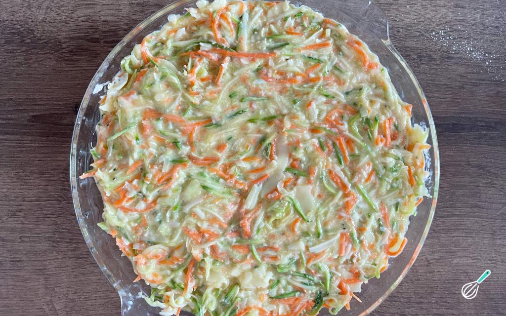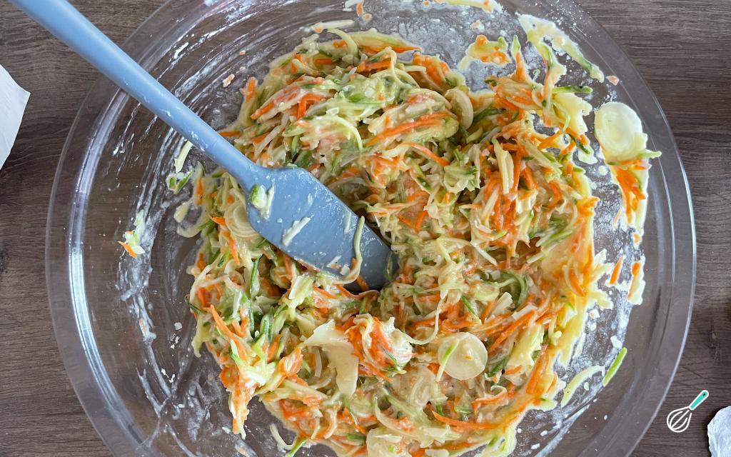 Misture a abobrinha, a cenoura, o parmesão, a mussarela, o sal, a pimenta do reino, o alho-poró e o fermento.