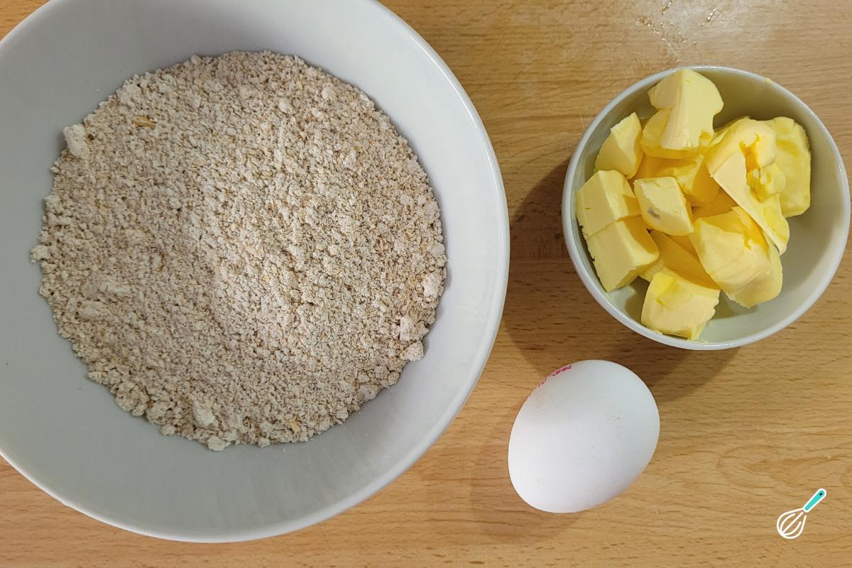 Separe os ingredientes para fazer a massa da torta. A farinha de aveia pode ser substituída por outra farinha sem glúten, de preferência a farinha de uma oleaginosa, como farinha de amêndoas, que tem mais liga. O ideal é que a manteiga esteja gelada para criar um efeito crocante de massa podre na massa.
