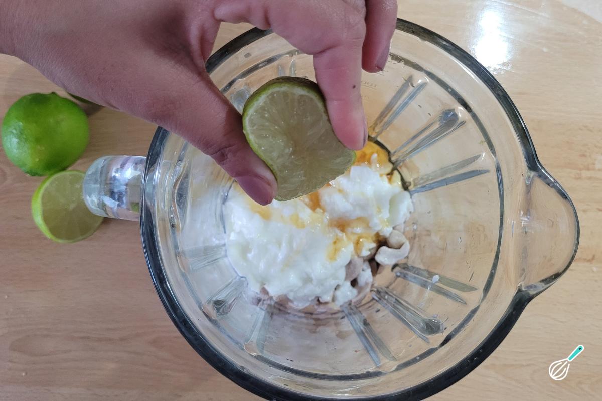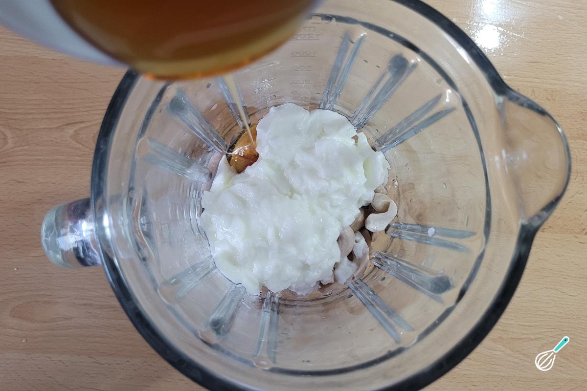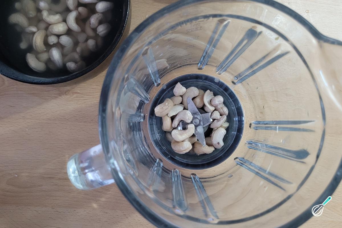 Coloque a castanha de caju no liquidificador sem a água do molho. É importante que a castanha de caju tenha ficado de molho por pelo menos 8 horas para que fique bem molinha e vire um creme na hora de bater, sem pedacinhos.