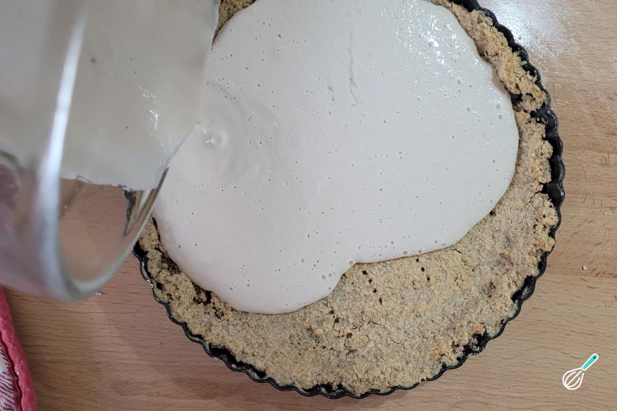 Retire a massa do forno e despeje o recheio sobre a massa. Leve à geladeira até que o recheio esteja firme.