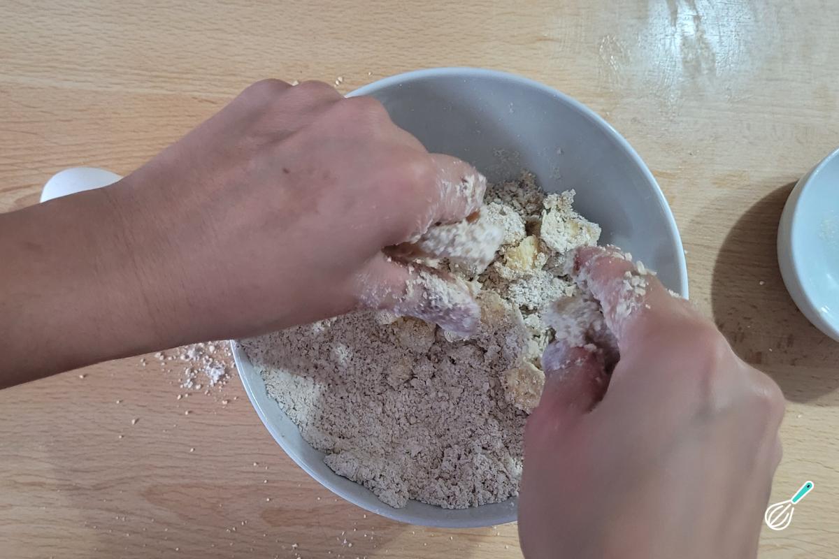 Com as pontas dos dedos, vá quebrando a manteiga em pedacinhos até chegar em uma consistência de areia molhada ou areia (mesma técnica usada para fazer massa podre tradicional).