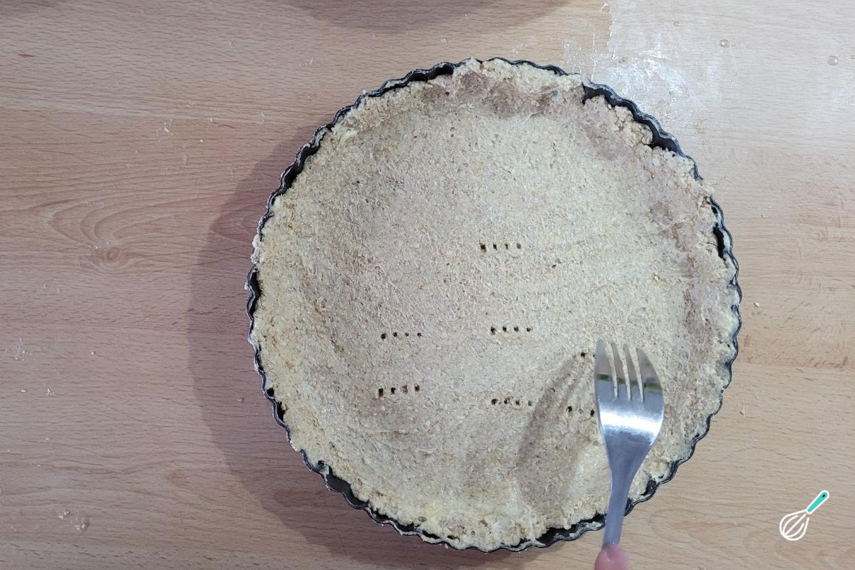 Faça furos no fundo da massa com um garfo para evitar que ela infle no forno. Leve ao forno pré-aquecido a 180oC por uns 10 minutos ou até que a massa esteja firme e dourada.