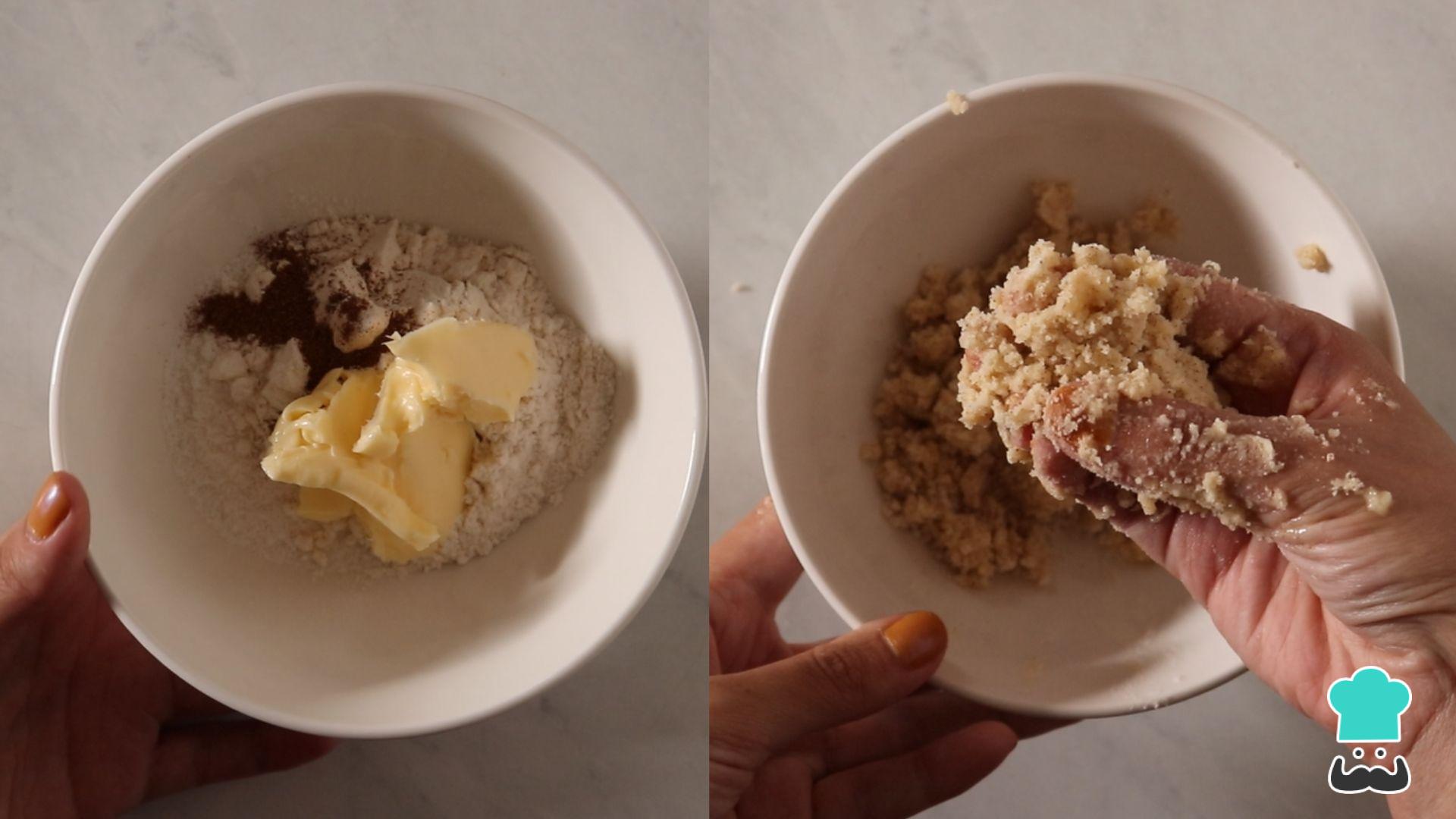 Em uma tigela coloque a farinha de trigo, o açúcar, a canela em pó, a pitada de sal e a manteiga picada e misture com a ponta dos dedos até virar uma farofa bem úmida.