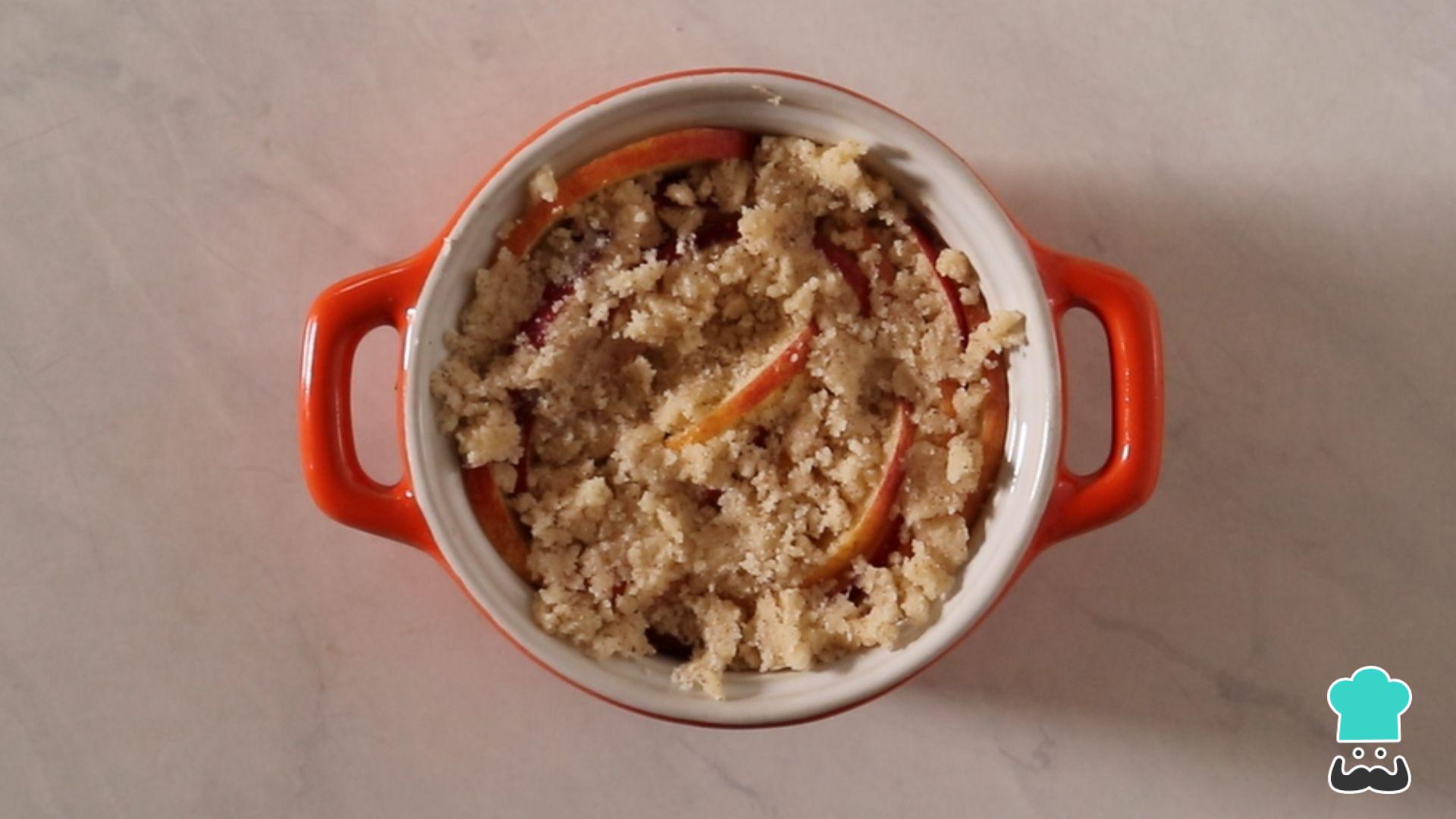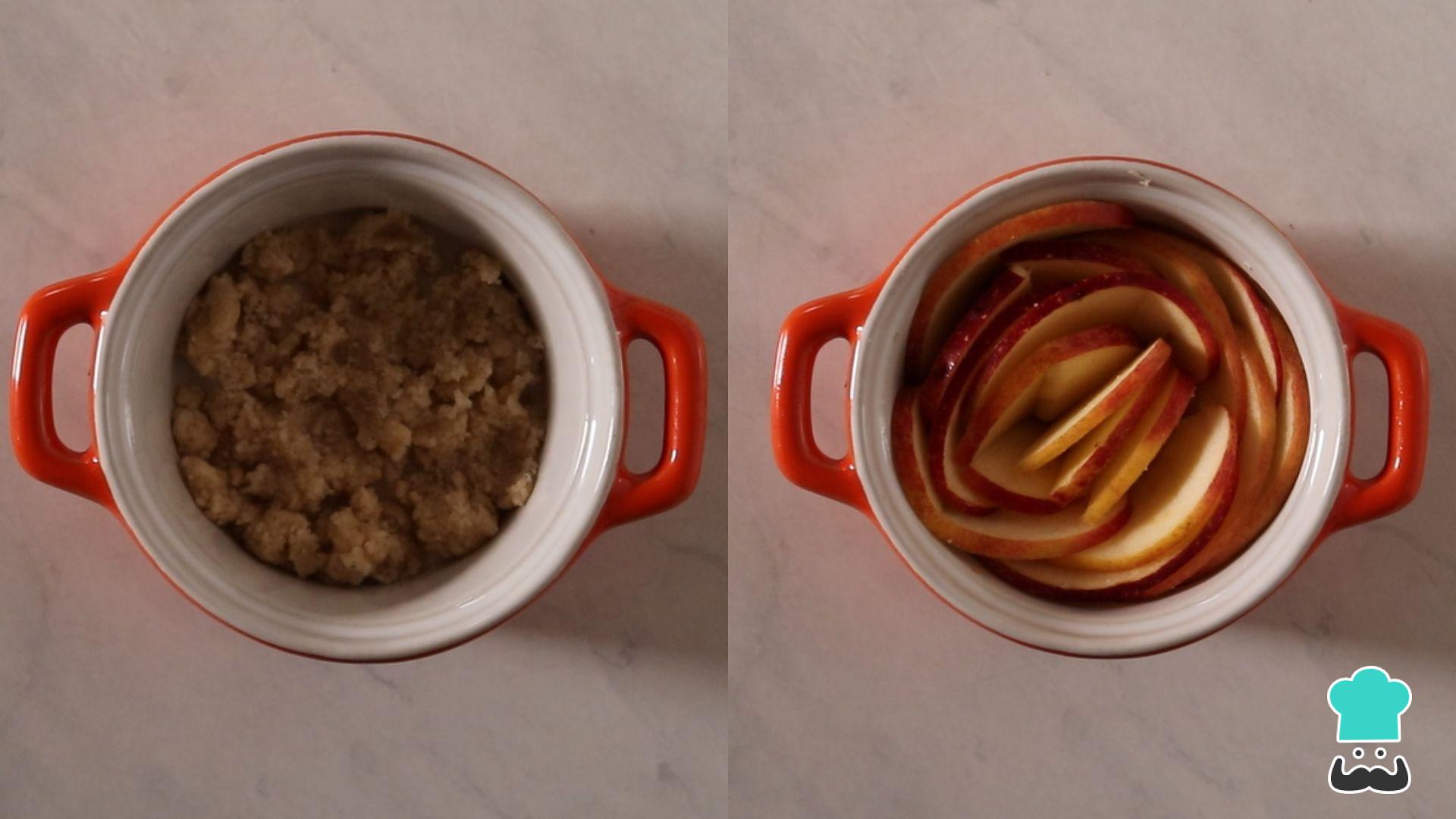 Em um refratário coloque metade da farofa e em seguida as maçãs fatiadas.