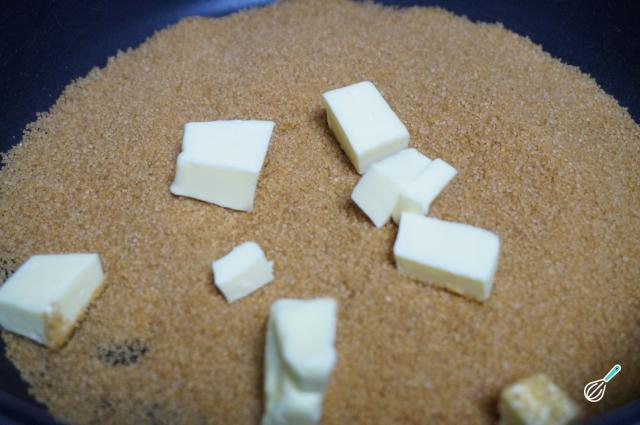 Prepare o caramelo antes de começar a fazer a torta de maçã invertida. Para fazer isso, leve ao fogo baixo uma panela ou frigideira alta com o açúcar e a manteiga e deixe que, aos poucos, eles derretam. Mexa com uma colher de pau para acelerar o processo.