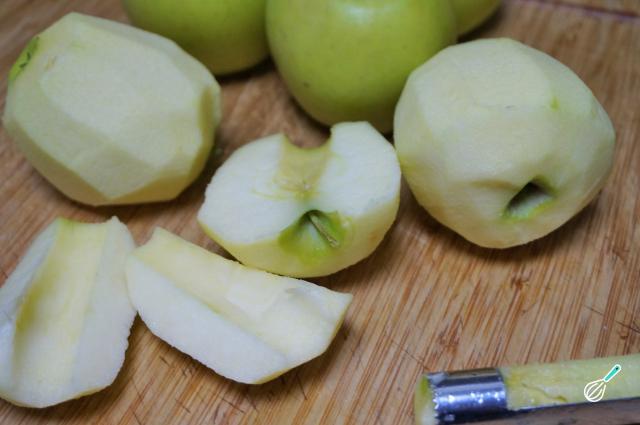 Enquanto prepara o caramelo, ligue o forno nos 180ºC, com calor em cima e em baixo, e descasque as maçãs. Retire o meio e corte-as em quatro partes iguais.