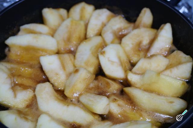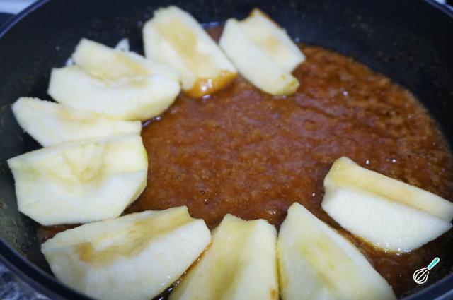 Você vai saber que o caramelo está pronto quando tiver uma cor amarronzada, mas não muito escura. Nesse ponto, transfira para uma forma de bolo redonda e arrume as maçãs sobre ele, com a parte arredondada voltada para baixo.