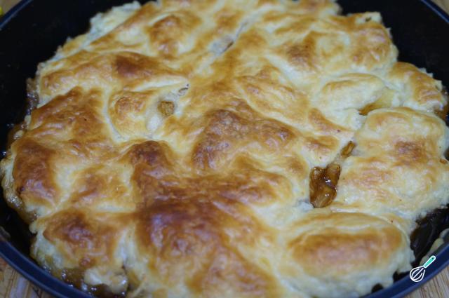 Depois retire a forma do forno e cubra as maçãs com a massa folhada, acomodando as bordas para dentro. Com um garfo, pique a massa (para evitar que ela suba muito enquanto assa).