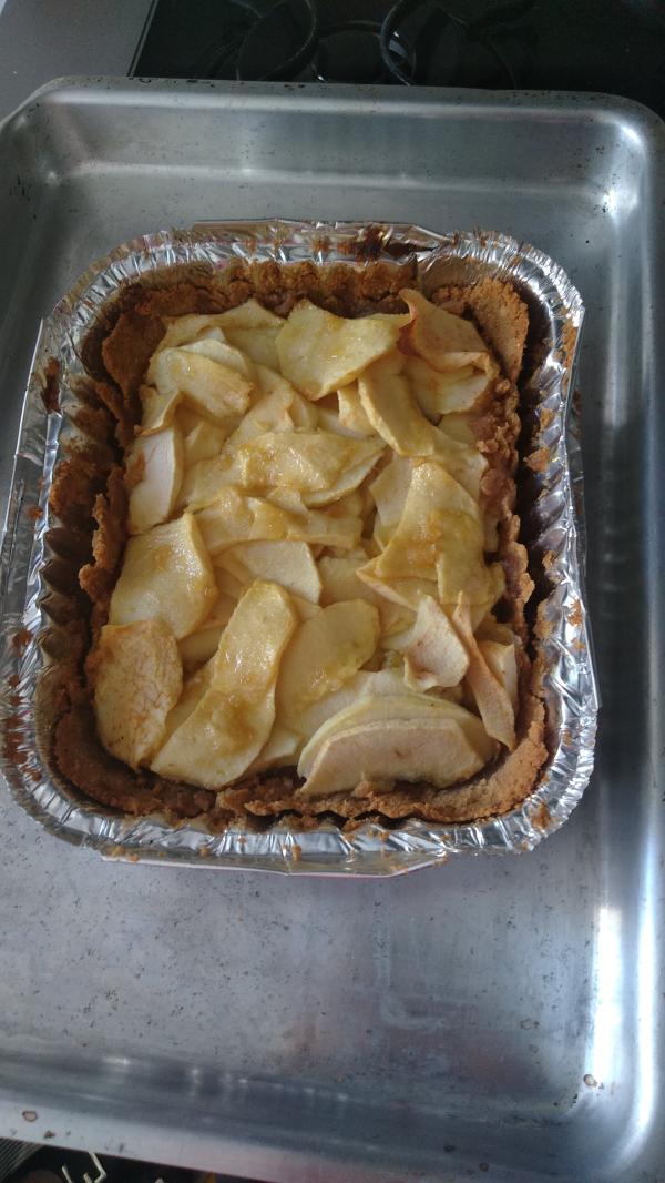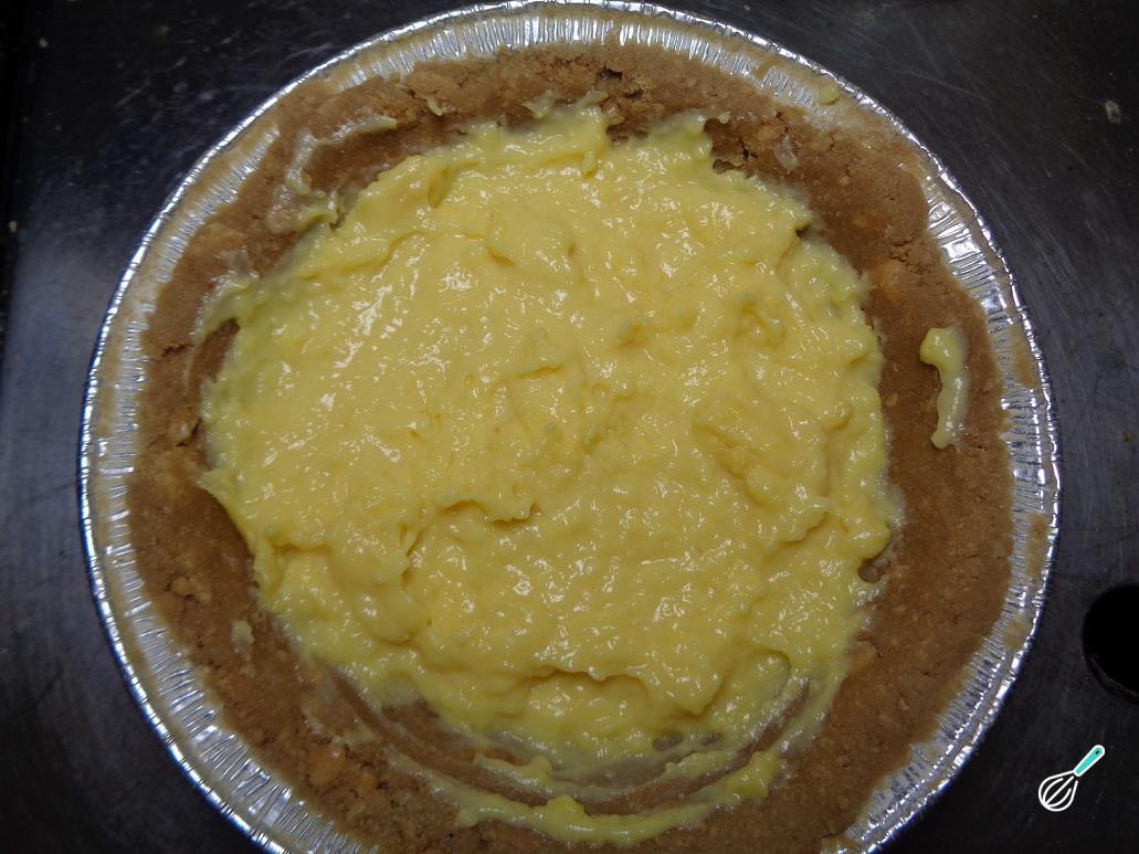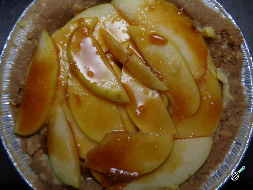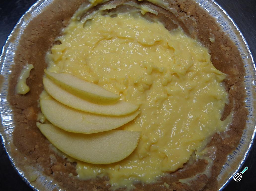 Quando tiver arrefecido um pouco, despeje o creme sobre a base de biscoito para montar a torta de maçã. Espalhe bem para cobrir todo o interior da torta.
