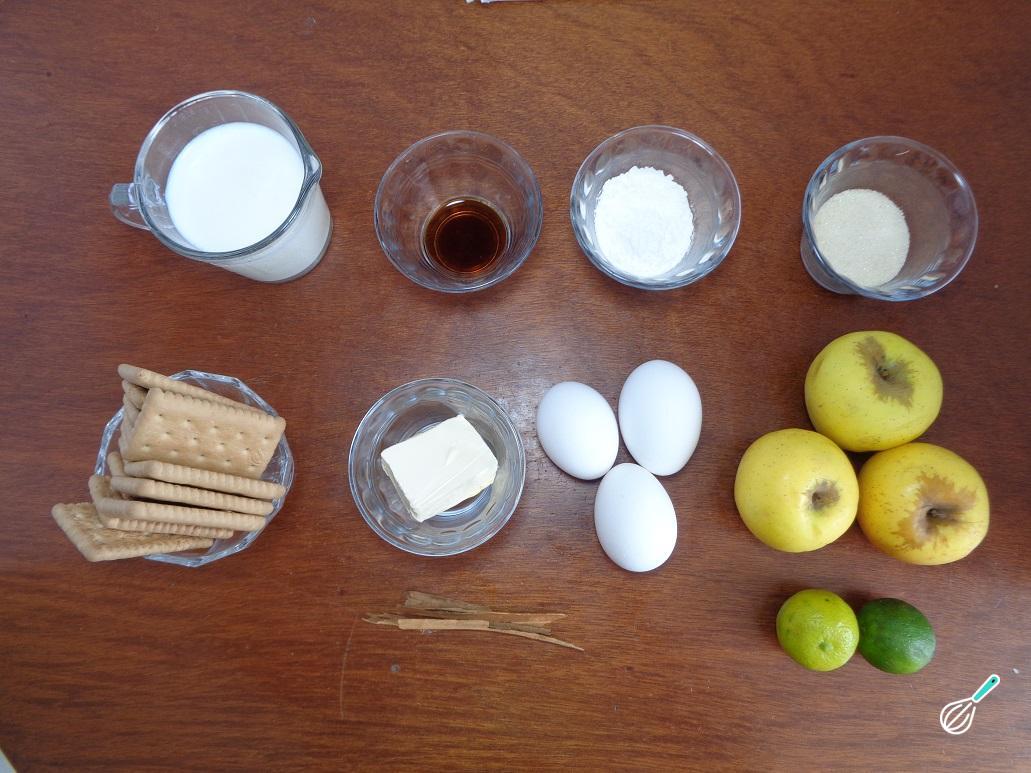 Pode conferir os ingredientes necessários para a preparação desta deliciosa torta de maçã com creme na foto seguinte. Lembre-se de que você pode usar qualquer tipo de biscoitos doces como biscoitos Maria ou digestivos.