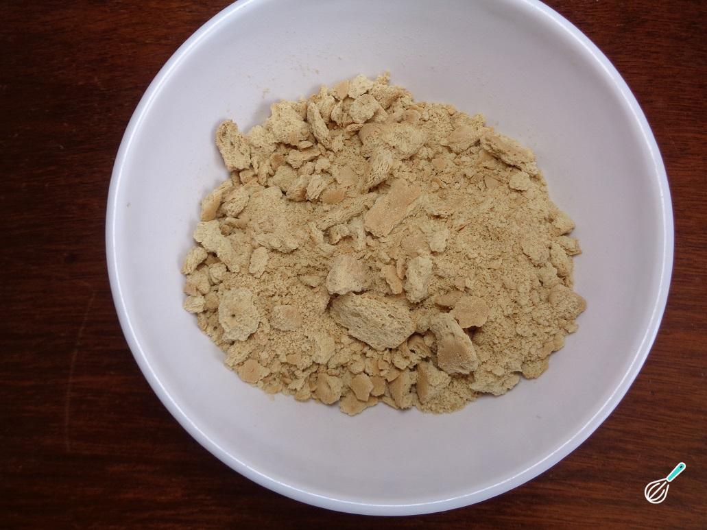 Comece pela preparação da base de biscoito para torta de maçã. Triture os biscoitos no liquidificador até virarem pó.