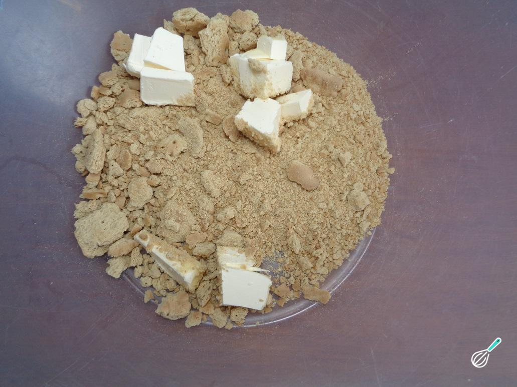Adicione a manteiga e misture com biscoitos em pó. Integre bem estes dois ingredientes até obter uma mistura pastosa e maleável.