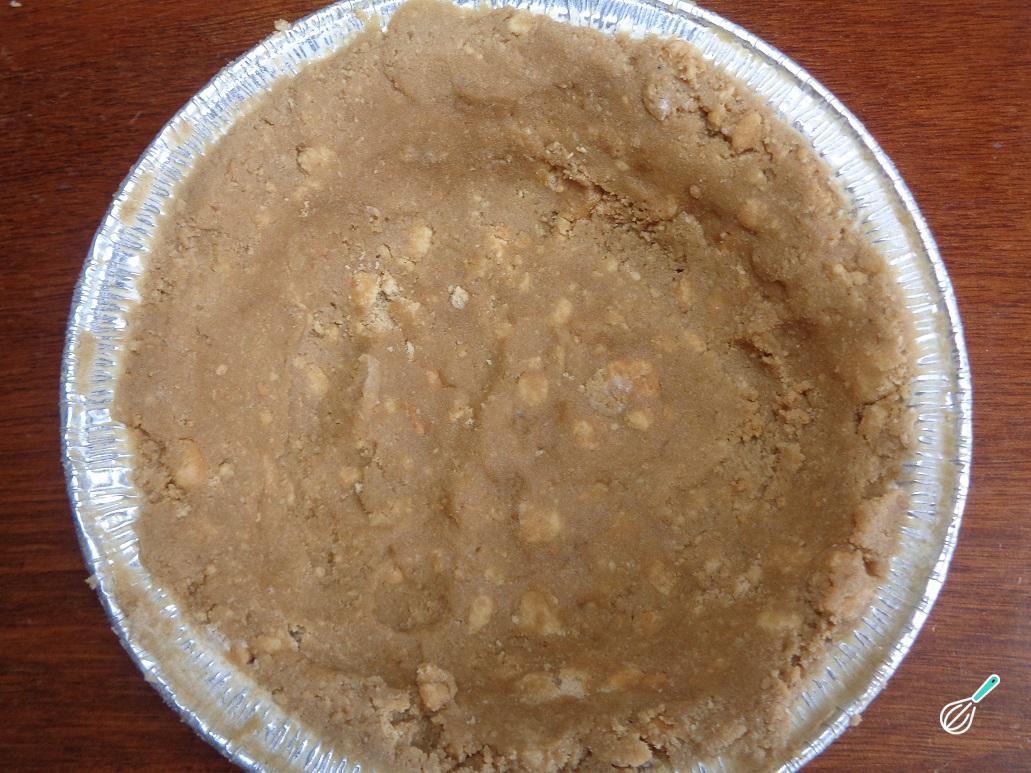 Use esta pasta para cobrir a base da forma onde pretende fazer a torta de maçã. A ideia é cobrir completamente a base e as laterais, tentando que a camada de biscoito fique um pouco grossa e bem nivelada. Reserve.