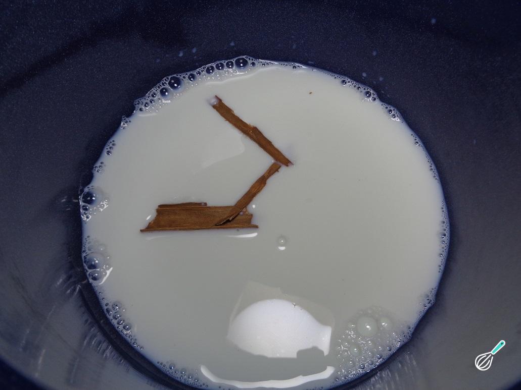 Em seguida, prepare o creme que será usado como recheio da torta de maçã. Para isso, aqueça o leite juntamente com o pau de canela em fogo médio até ferver.
