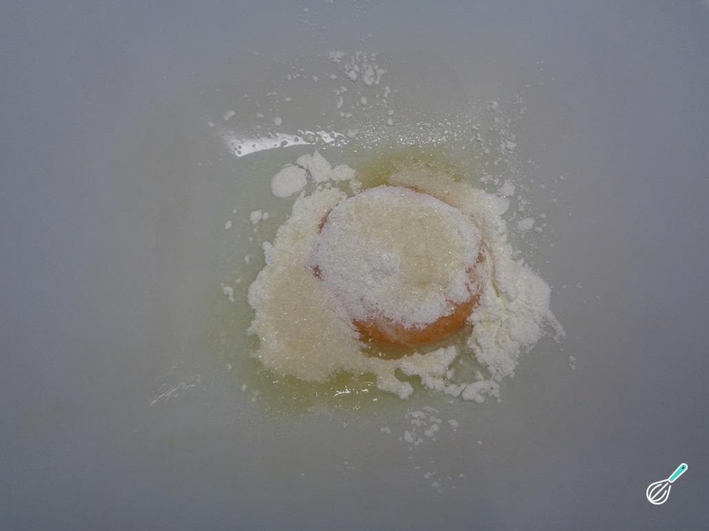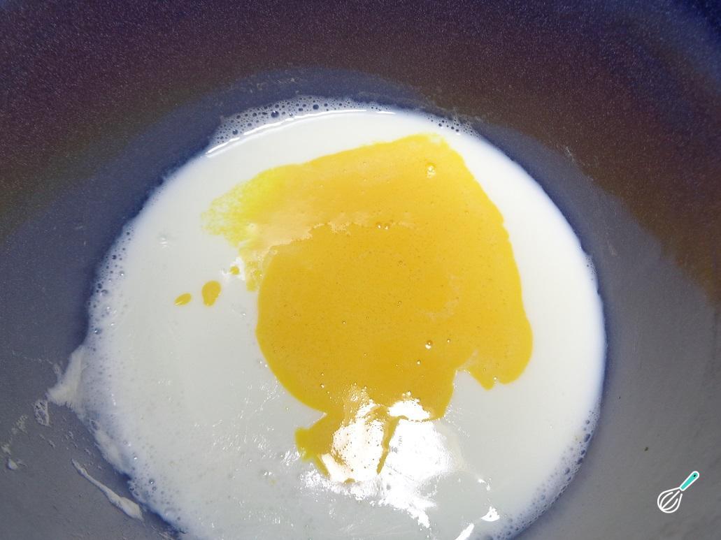 Enquanto o leite aquece, bata as gemas de ovo com o açúcar, a maisena e a essência de baunilha. Misture bem estes três ingredientes até obter uma mistura homogênea.