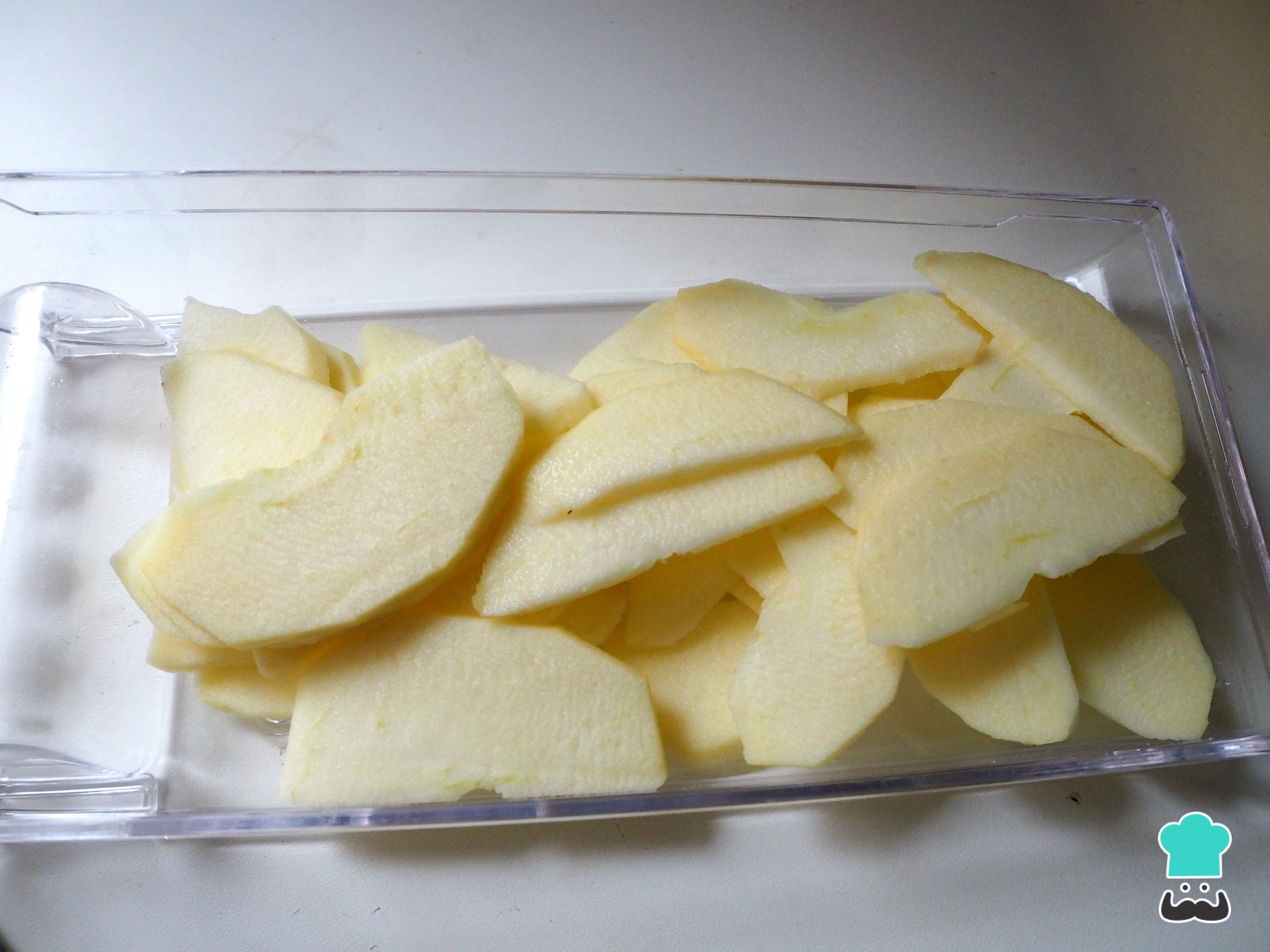 Comece esta torta de maçã com maisena por descascar e retirar o caroço das maçãs. De seguida corte-as em cubos pequenas e uma metade de maçã em fatias finas.