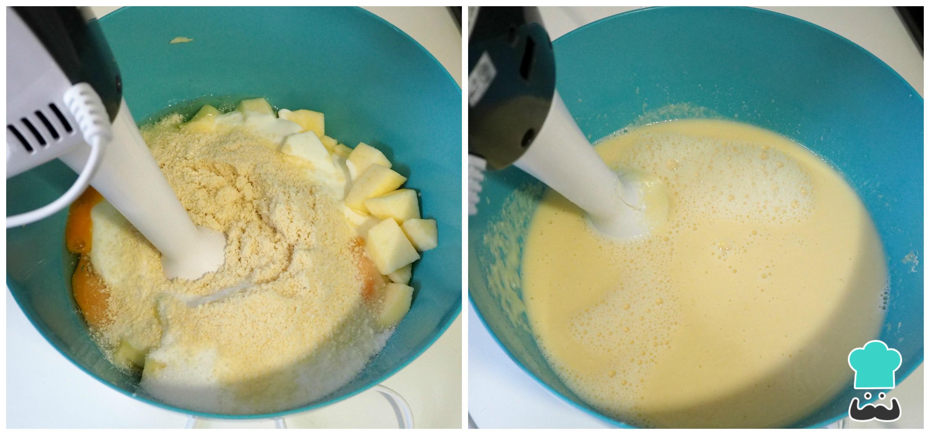 Coloque os cubos de maçã em uma tigela ou liquidificador e adicione os restantes ingredientes: o açúcar, o iogurte, os ovos e a maisena. Bata muito bem.