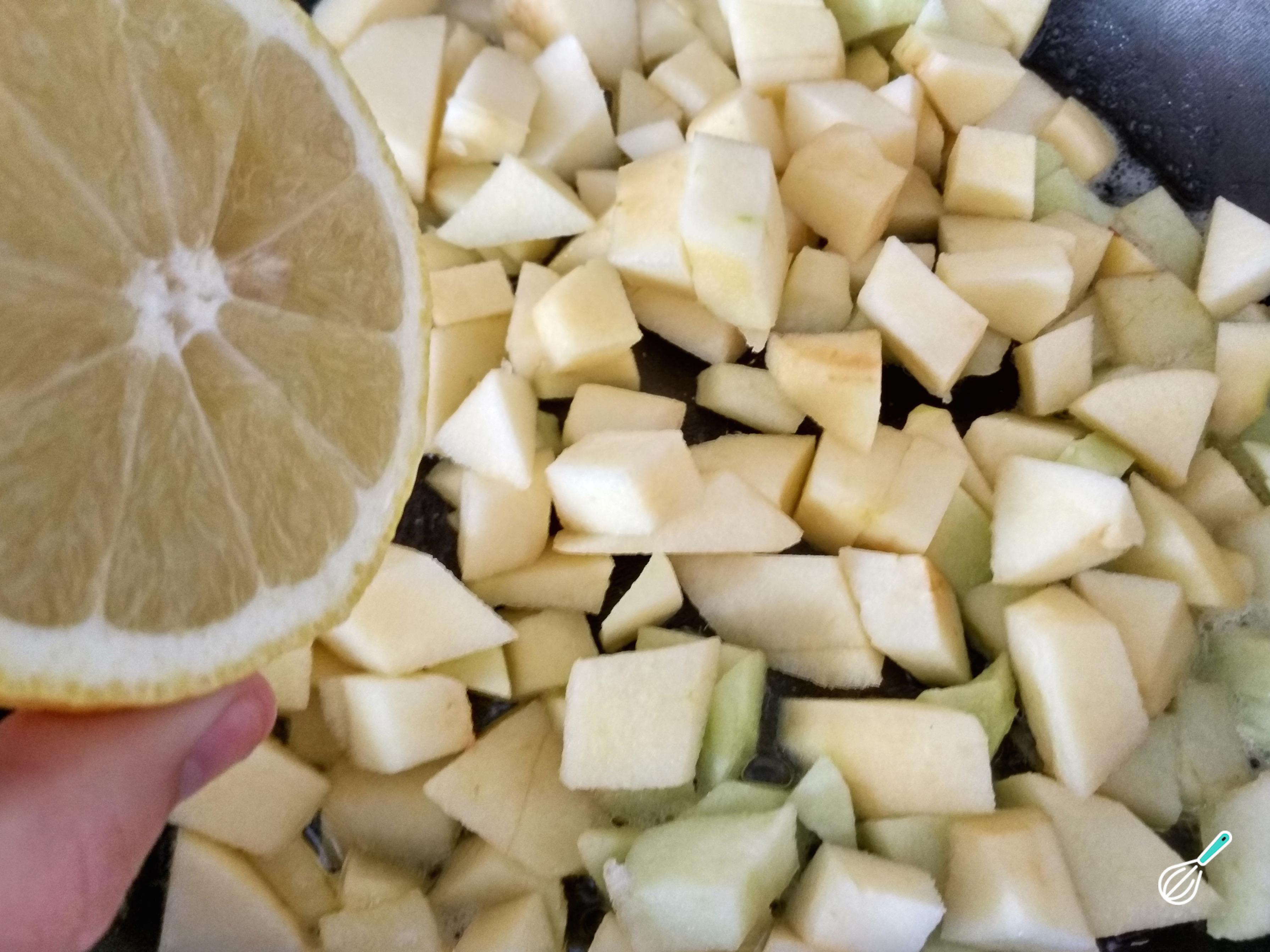 Descasque e corte a maçã em cubos. Leve a manteiga a derreter em uma frigideira, adicione a maçã e salteie. Passados uns minutos de saltear a maçã, junte o suco de limão.