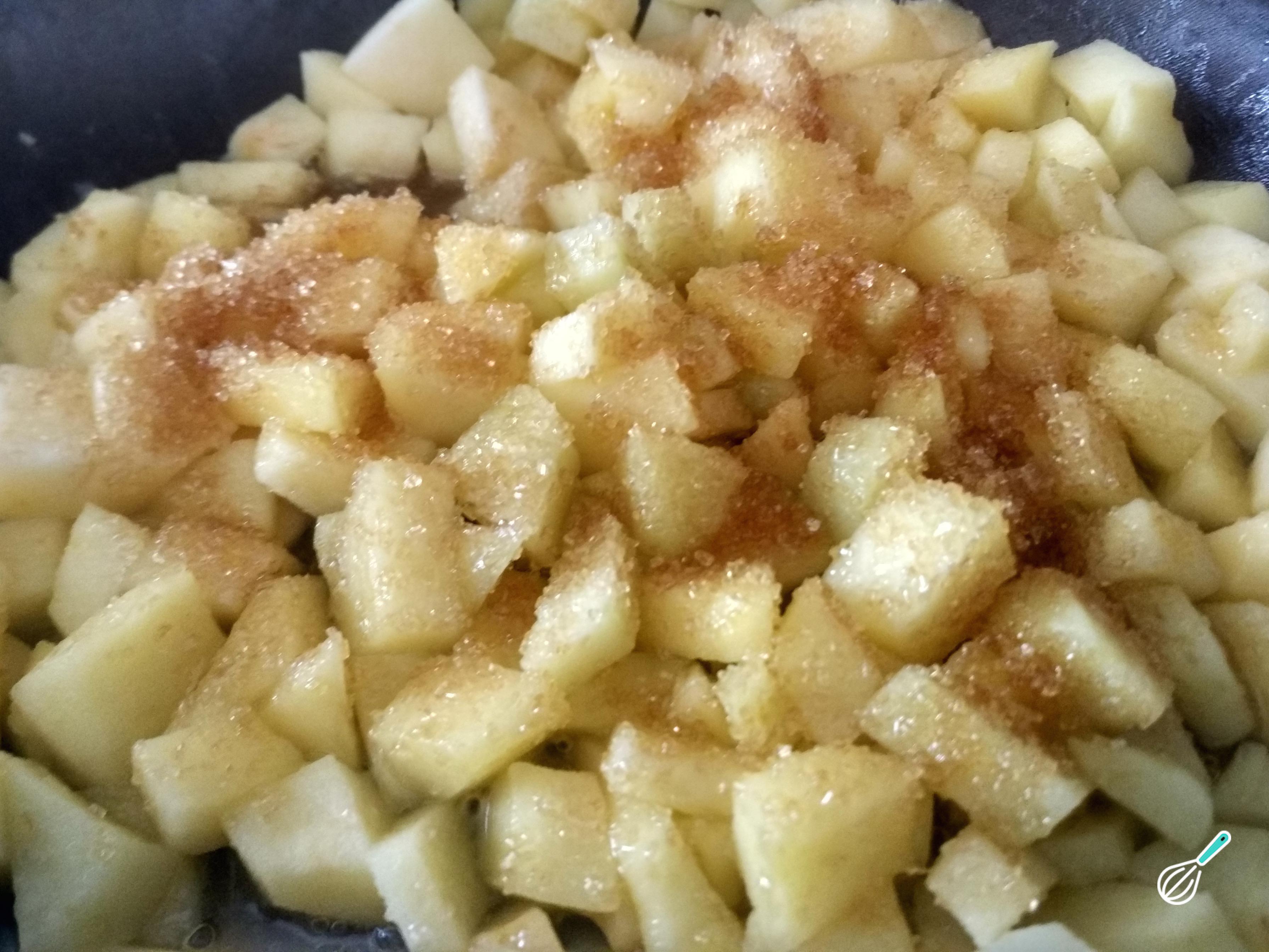 Incorpore o açúcar moreno e mexa para que se integre com os restantes ingredientes. Deixe cozinhar a maçã por 10 minutos.