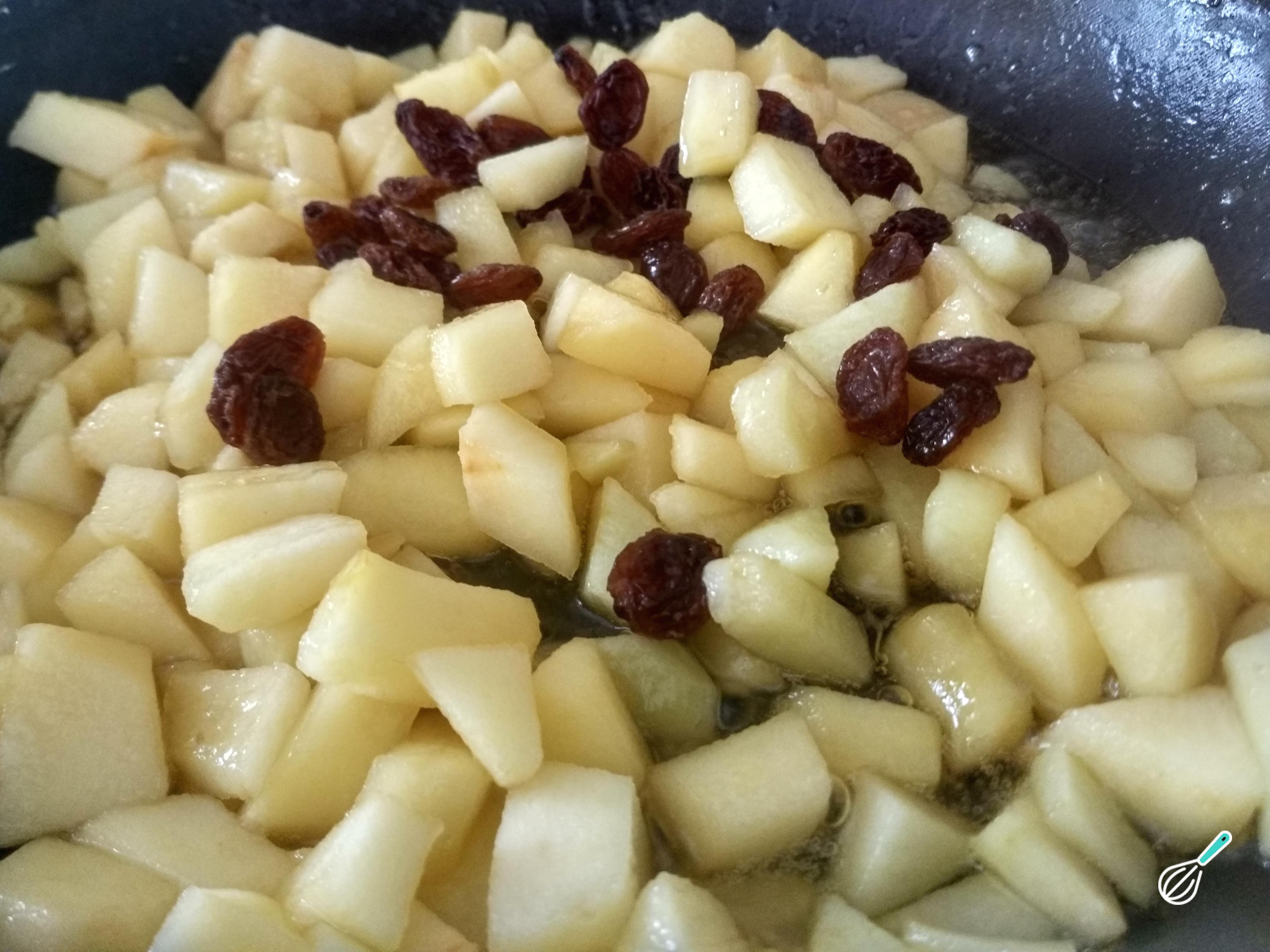Adicione a canela, as passas de uva e deixe cozinhar por mais três a quatro minutos.