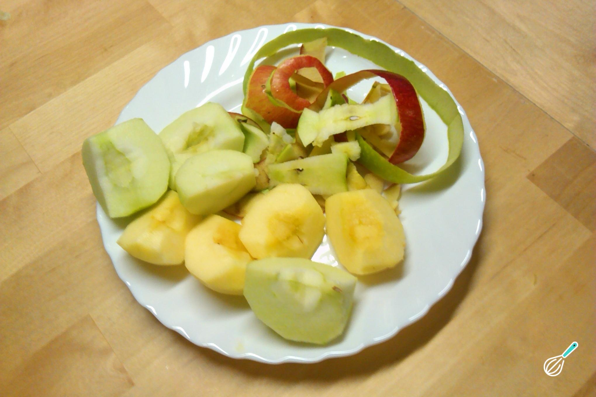 Em seguida descasque as maçãs e corte em pedaçinhos. Você pode usar apenas uma variedade de maçã ou várias, para conseguir uma mistura de texturas e sabores mais acentuada na torta.