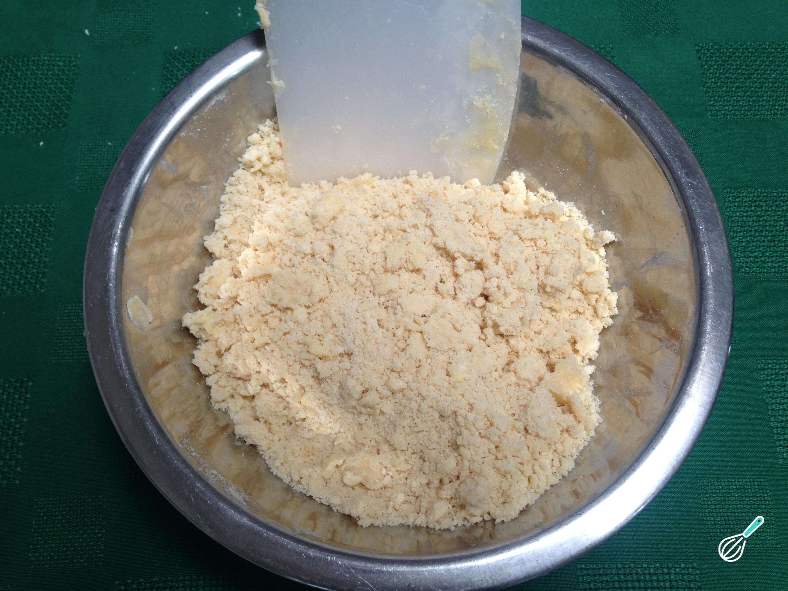 Coloque a farinha e a manteiga cortada em cubos em uma tigela grande. Com a ajuda de uma faca, pique a manteiga com a farinha de forma a conseguir uma consistência de farofa.